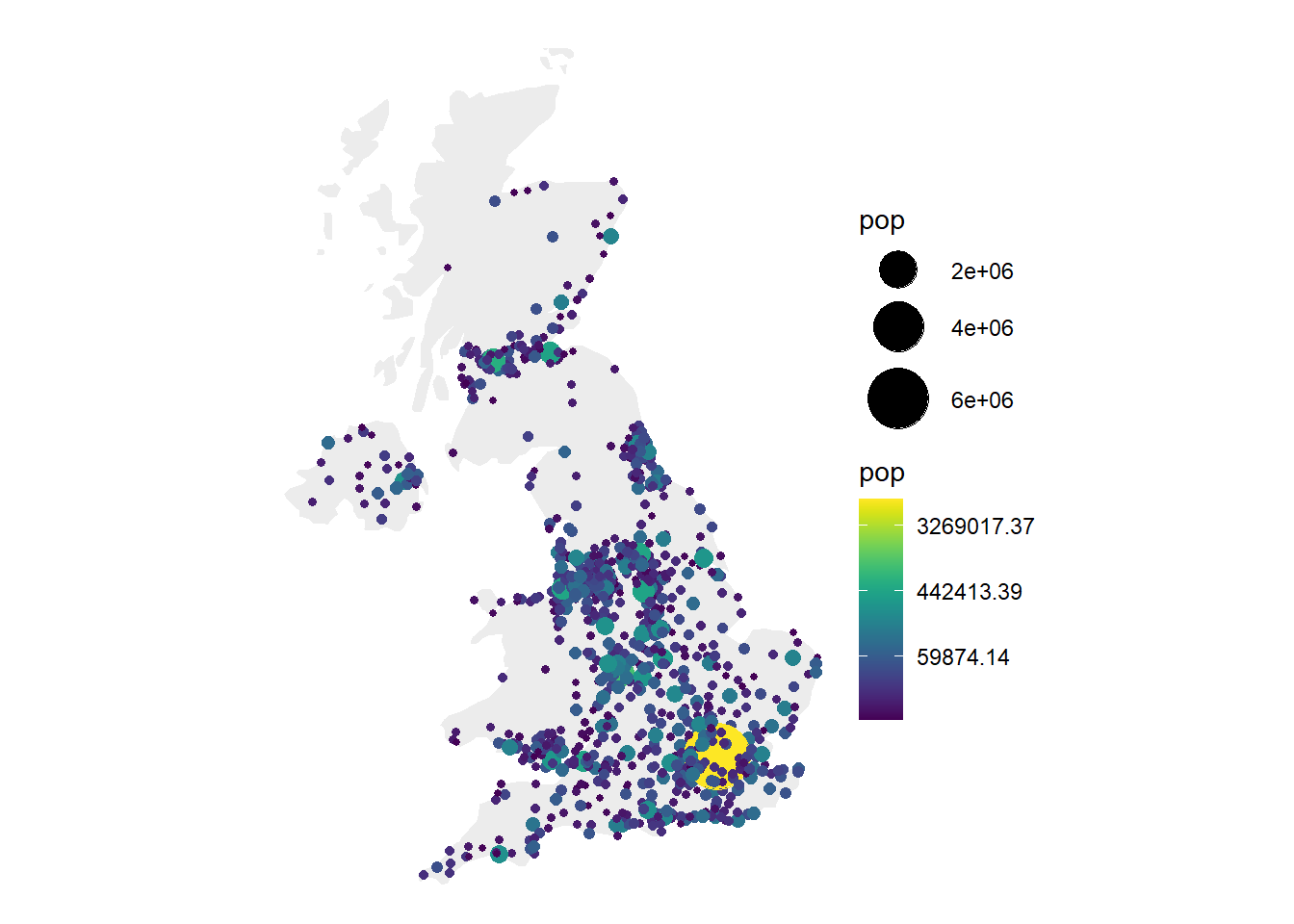 geom_point( data=data, aes(x=long, y=lat, size=pop, color=pop)) +