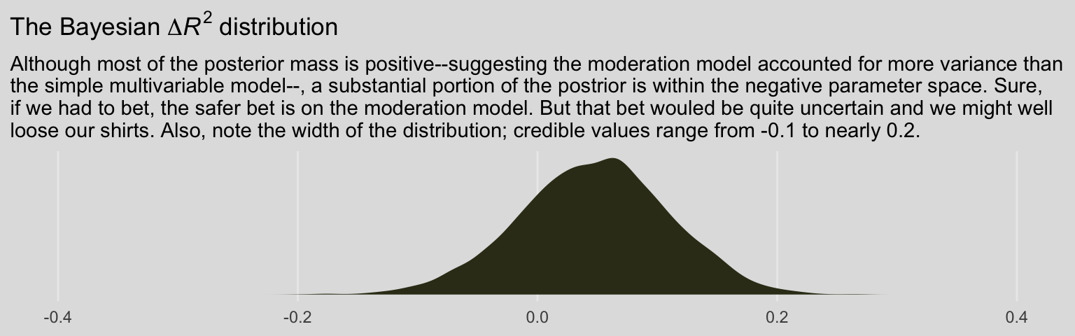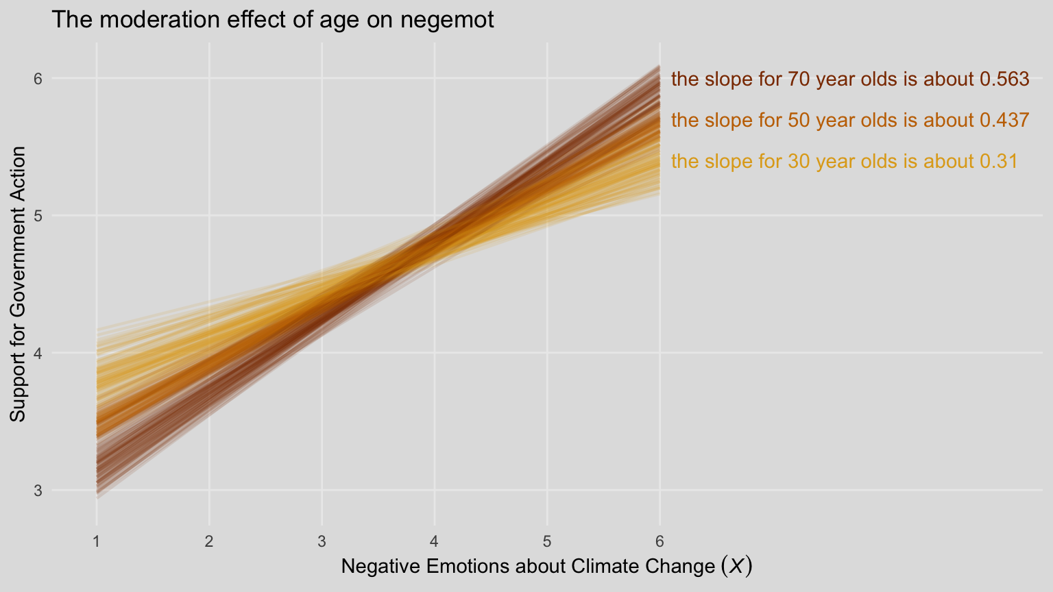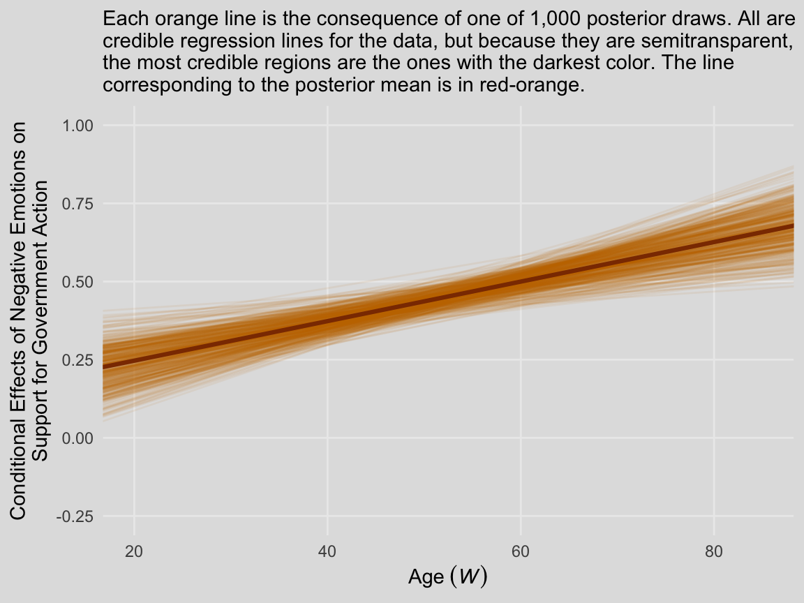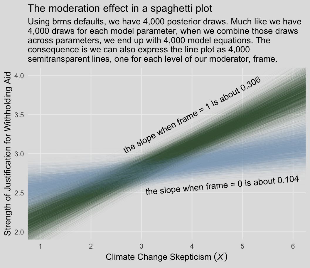 subtitle = "Using brms defaults, we have 4,000 posterior draws. Much like we have\n4,000 draws for each model parameter, when we combine those draws\nacross parameters, we end up with 4,000 model equations. The\nconsequence is we can also express the line plot as 4,000\nsemitransparent lines, one for each level of our moderator, frame.",