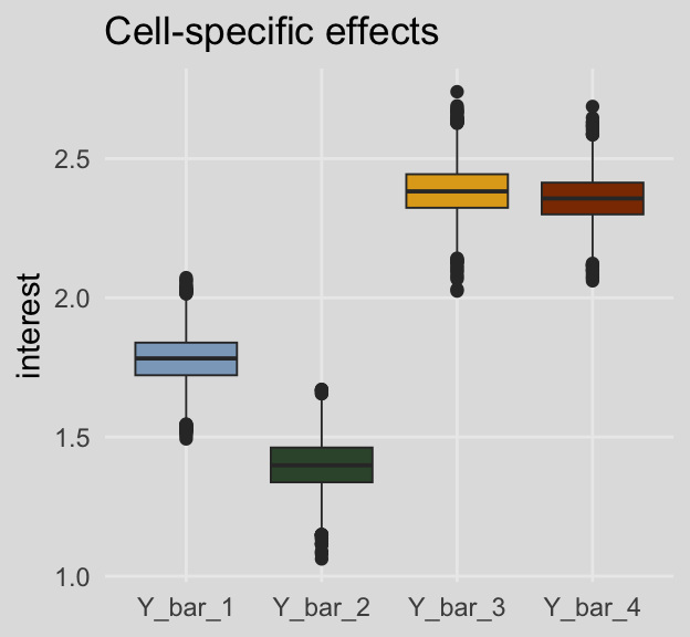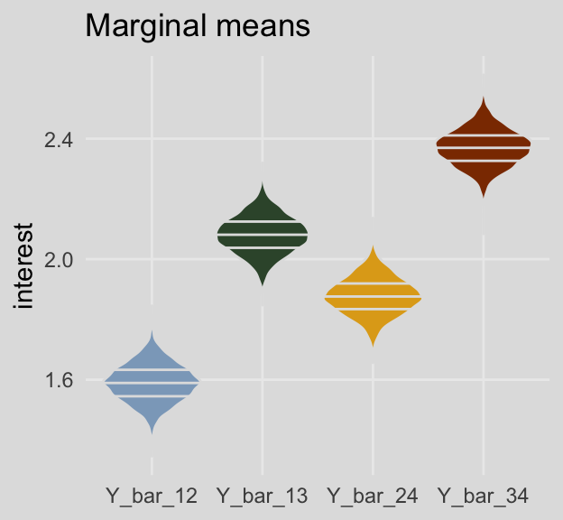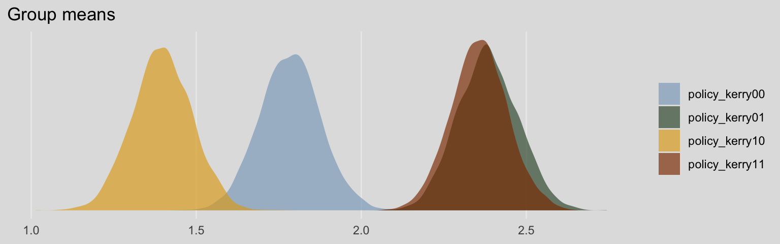 Since we’re square in single-level regression land with our brms approach, there’s no direct analogue for us, here. However, notice the post-ANOVA \(t\)-tests Hayes presented on page 300. If we just want to consider the \(2 \times 2\) structure of our two dummy variables as indicative of four groups, we have one more coding system available for the job. With the handy str_c() function, we’ll concatenate the policy and kerry values into a nominal variable, policy_kerry. Here’s what that looks like: