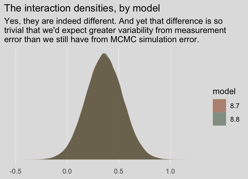 subtitle = "Yes, they are indeed different. And yet that difference is so\ntrivial that we'd expect greater variability from measurement\nerror than we still have from MCMC simulation error.",