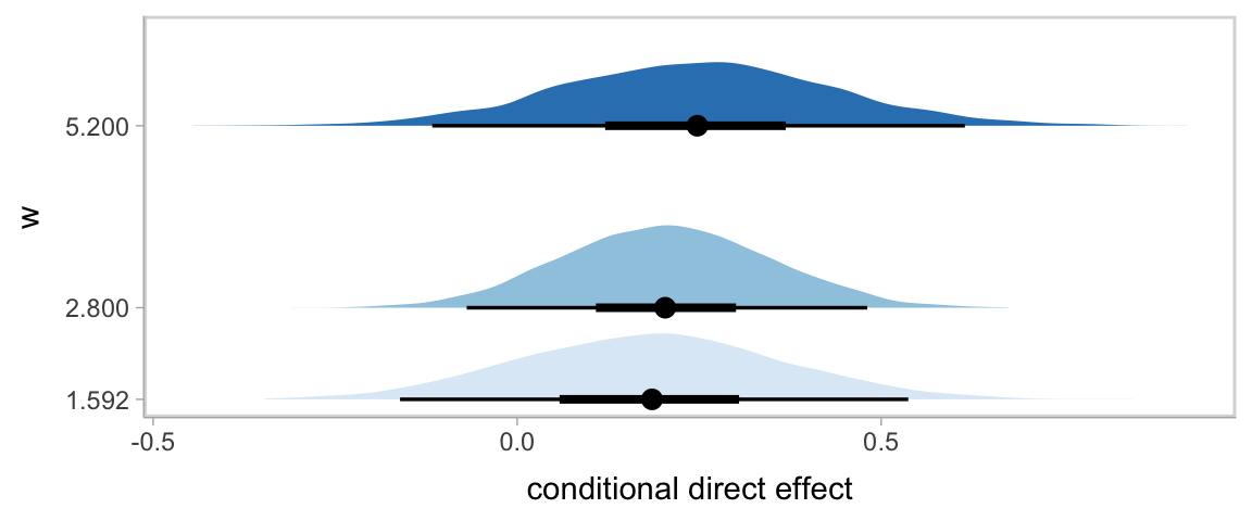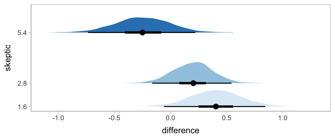 In Hayes’s Figure 12.2, he emphasized the differences at the three levels of skeptic. If you want the full difference score distributions in a pick-a-point-approach sort of way, you might plot the densities with tidybayes::stat_halfeye(), which places coefficient plots at the base of the densities. In this case, we show the posterior medians with the dots, the 50% intervals with the thick horizontal lines, and the 95% intervals with the thinner horizontal lines.