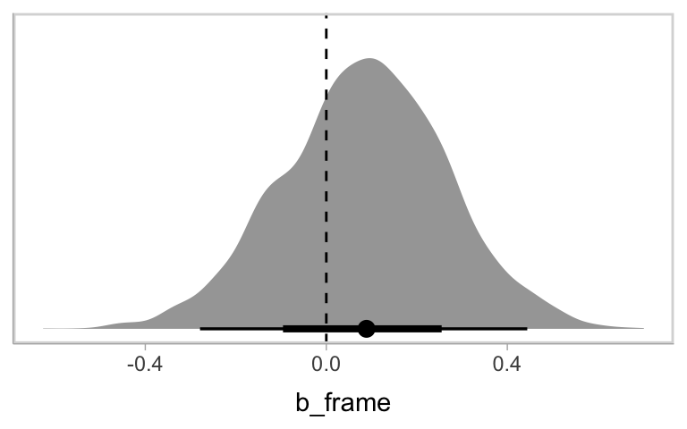 Hayes interpreted the coefficient for frame through the lens of a \(t\) statistic and accompanying \(p\)-value. We’ll just plot the posterior. For the figures in this chapter, we’ll take theme cues from the vignettes from Matthew Kay’s tidybayes package.