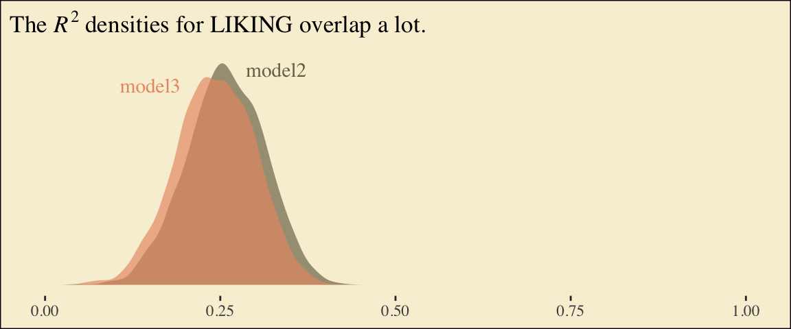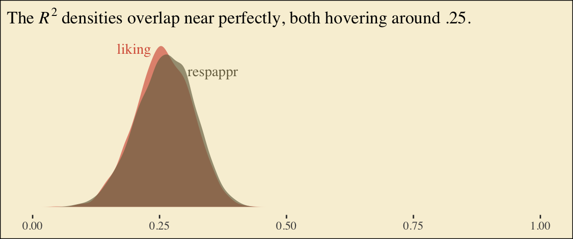 y_model <- bf(liking ~ 1 + d1 + d2 + respappr)There’s a third way to fit multivariate models in brms. It uses either the mvbrmsformula() function, or its abbreviated version, mvbf(). With these, we first define our submodels in br() statements like before. We then combine them within mvbf(), separated with a comma. If we’d like to avoid estimating a residual correlation, which we do in this project–, we then set rescore = FALSE. Here’s how it looks like for our second model.