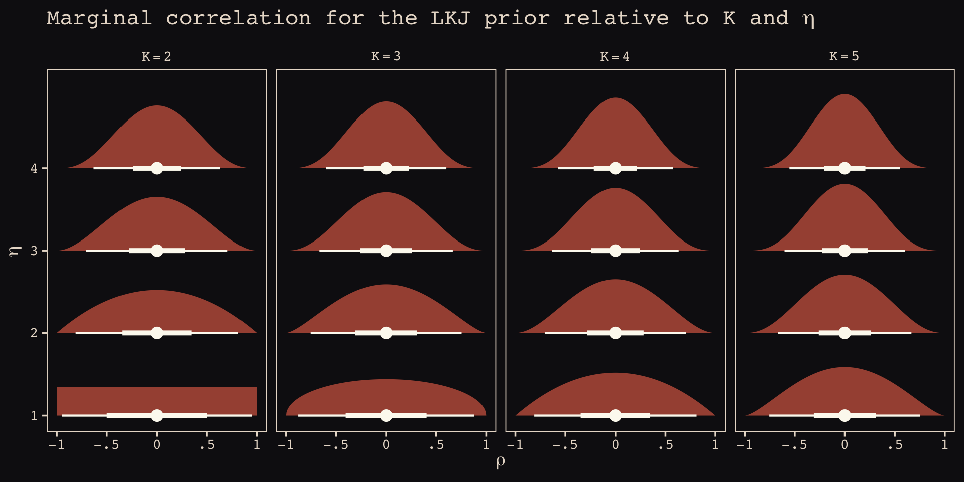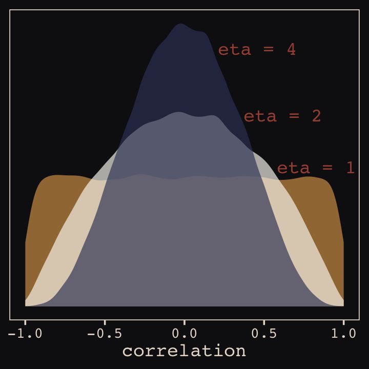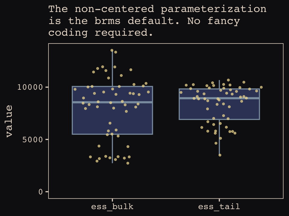 McElreath discussed how researchers might use other multivariate distributions to model multiple random effects. The only one he named as an alternative to the Gaussian was the multivariate Student’s \(t\). As it turns out, brms does currently allow users to use multivariate Student’s \(t\) in this way. For details, check out this discussion from the brms GitHub repository. Bürkner’s exemplar syntax from his comment on May 13, 2018, was y ~ x + (x | gr(g, dist = "student")). I haven’t experimented with this, but if you do, do consider sharing how it went.