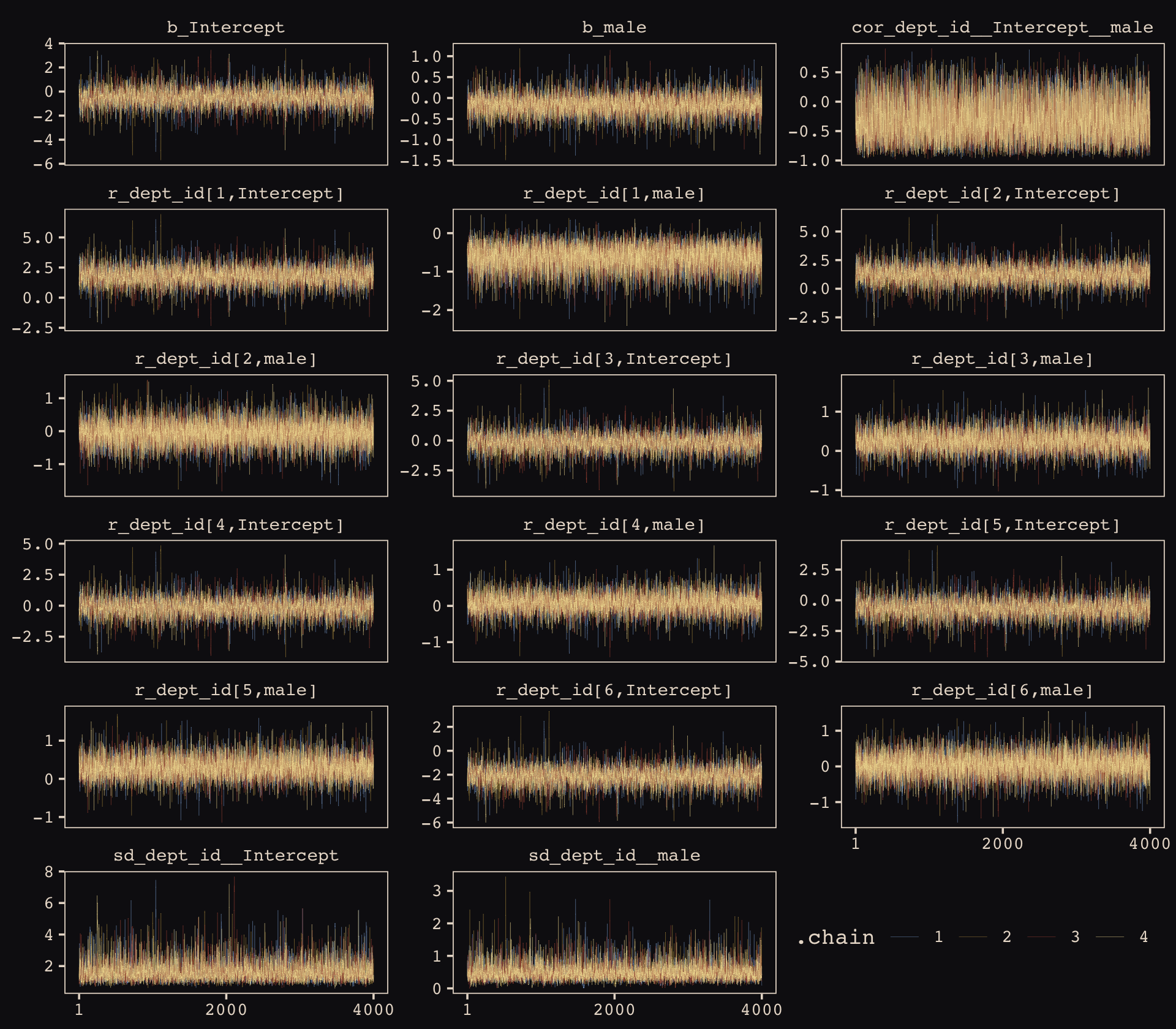 If you follow this section closely, it’s a great template for simulating multilevel code for any of your future projects. You might think of this as an alternative to a frequentist power analysis. Vourre has done some nice work along these lines, I have a blog series on Bayesian power analysis, and Kruschke covered the topic in Chapter 13 of his (2015) text.