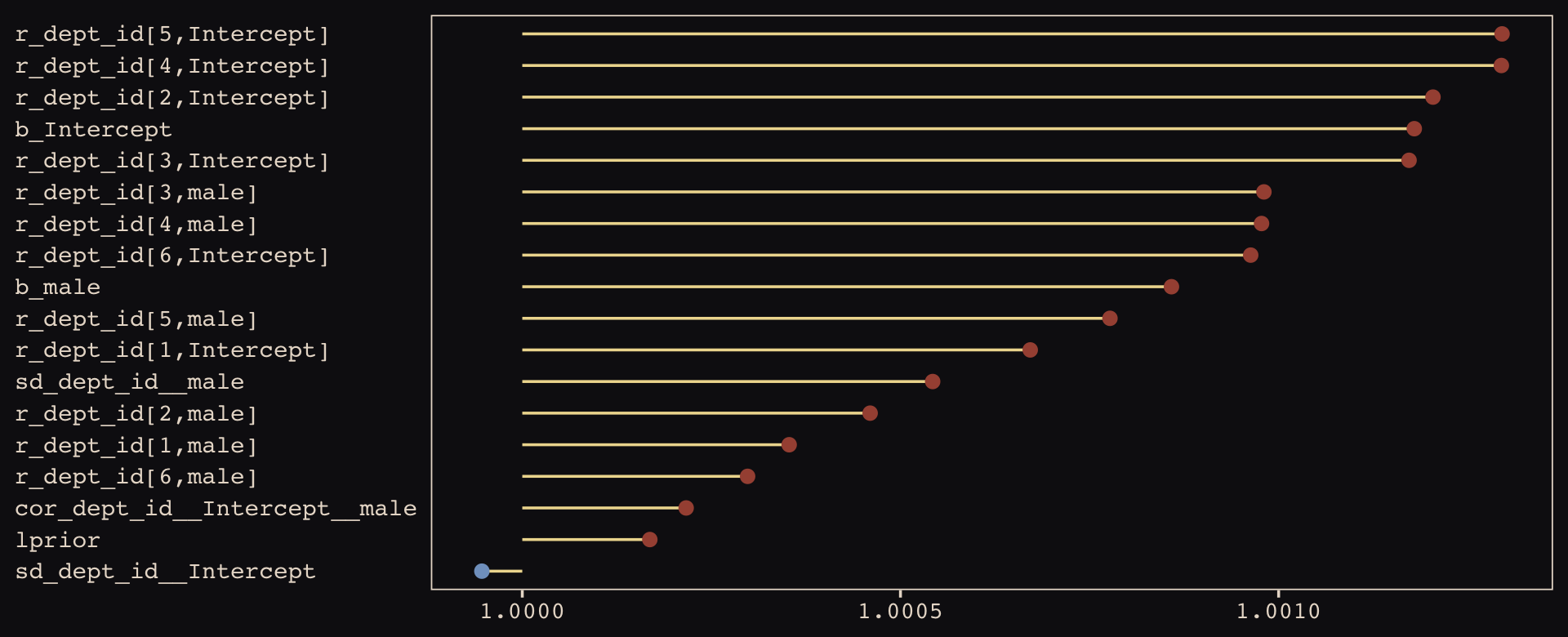 And if you wanted a one-sided Bayesian \(p\)-value for the male dummy for the full model, you execute something like this.