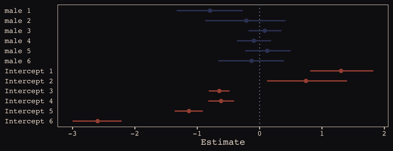 Note how the 95% intervals for all the random male slopes contain zero within their bounds. Here are the fixed effects.