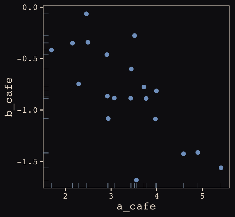 Let’s make sure we’re keeping this all straight. a_cafe = our café-specific intercepts; b_cafe = our café-specific slopes. These aren’t the actual data, yet. But at this stage, it might make sense to ask What’s the distribution of a_cafe and b_cafe? Our variant of Figure 13.2 contains the answer.