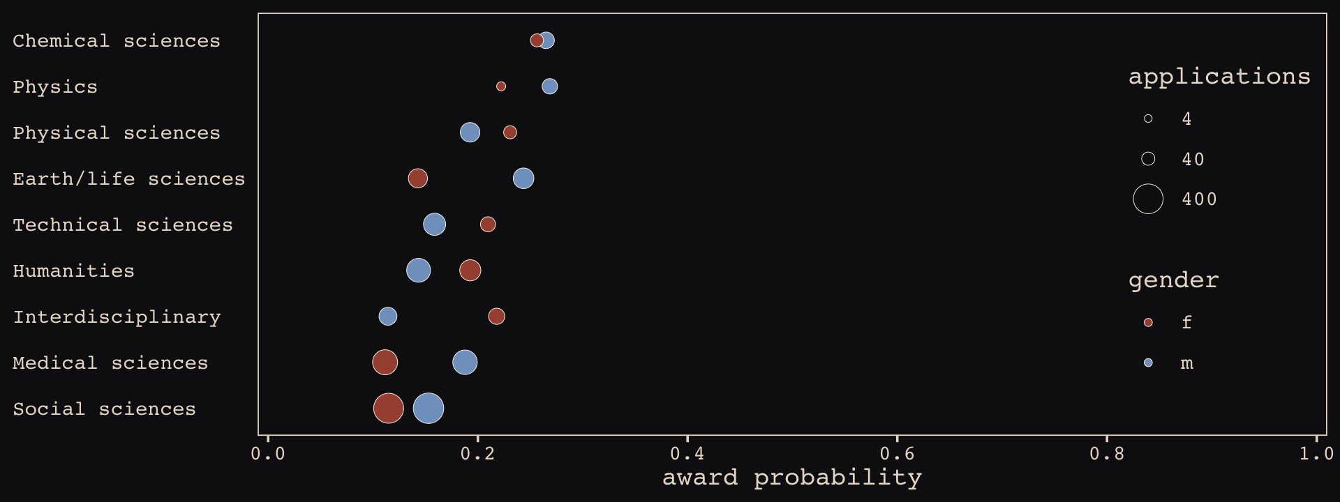 awards | trials(applications) ~ 1 + male + (1 | discipline),