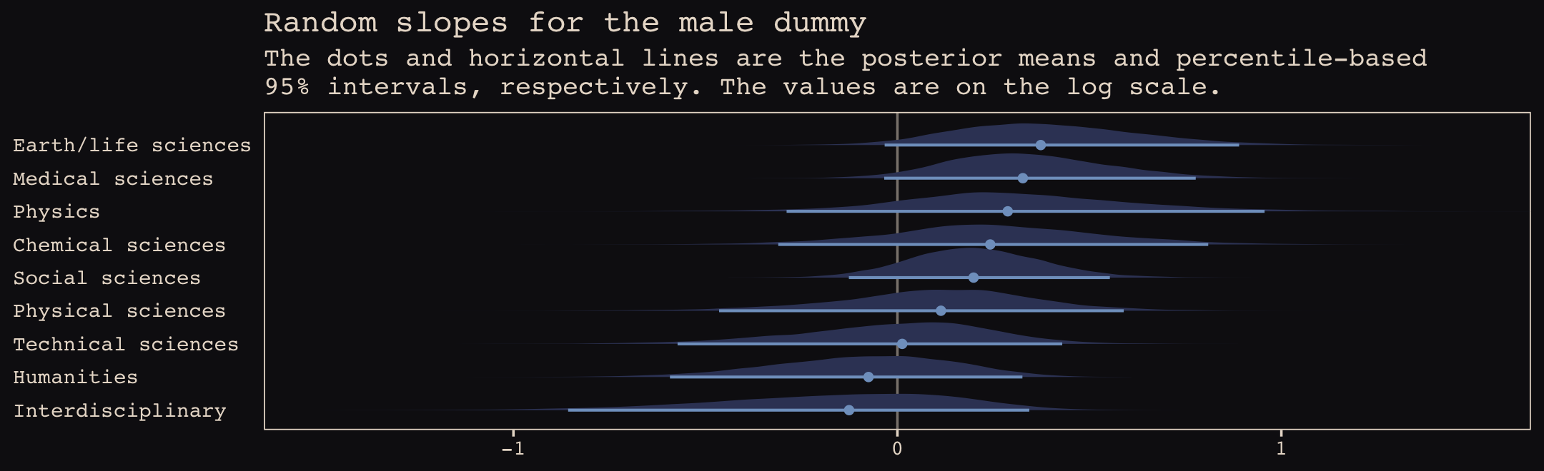 subtitle = "The dots and horizontal lines are the posterior means and percentile-based\n95% intervals, respectively. The values are on the log scale.",