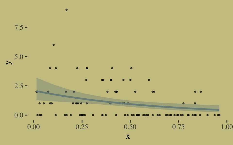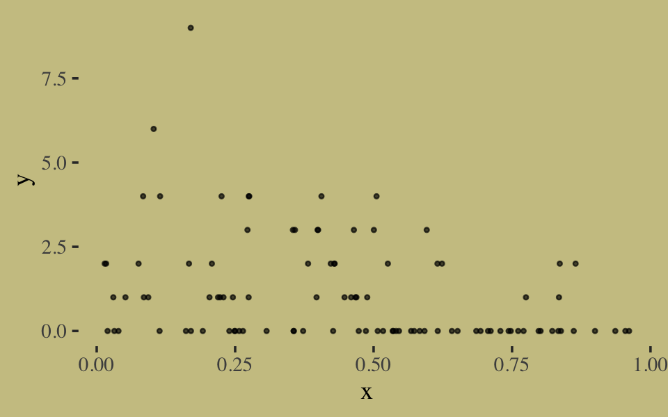y <- rgeom(n, prob = inv_logit_scaled(-1 + 2 * x))In case you’re curious, here are the data.