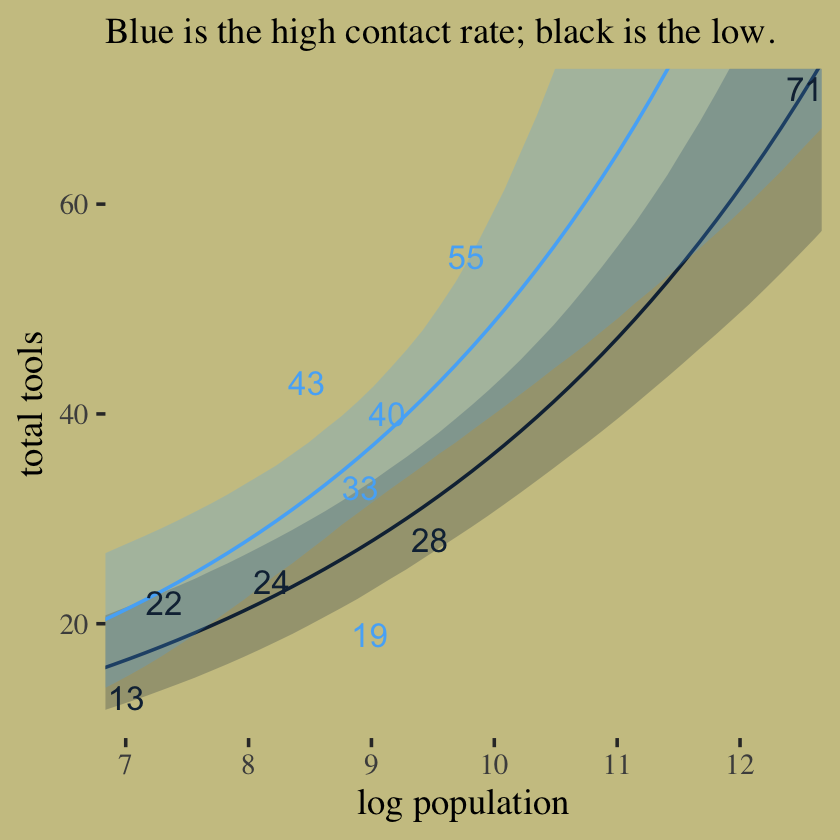 This chapter described some of the most common generalized linear models, those used to model counts. It is important to never convert counts to proportions before analysis, because doing so destroys information about sample size. A fundamental difficulty with these models is that the parameters are on a different scale, typically log-odds (for binomial) or log-rate (for Poisson), than the outcome variable they describe. Therefore computing implied predictions is even more important than before. (pp. 328–329)