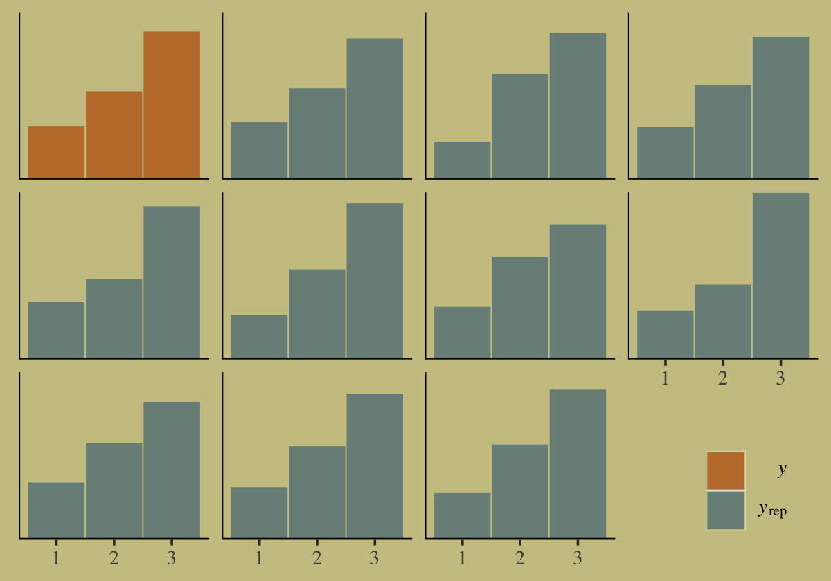 where \(y\) is some count variable, \(n\) is the number of trials, and \(p\) it the probability a given trial was a 1, which is sometimes termed a success. When \(n = 1\), then \(y\) is a vector of 0s and 1s. Presuming the logit link, which we just covered in Chapter 9, models of this type are commonly termed logistic regression. When \(n > 1\), and still presuming the logit link, we might call our model an aggregated logistic regression model, or more generally an aggregated binomial regression model.