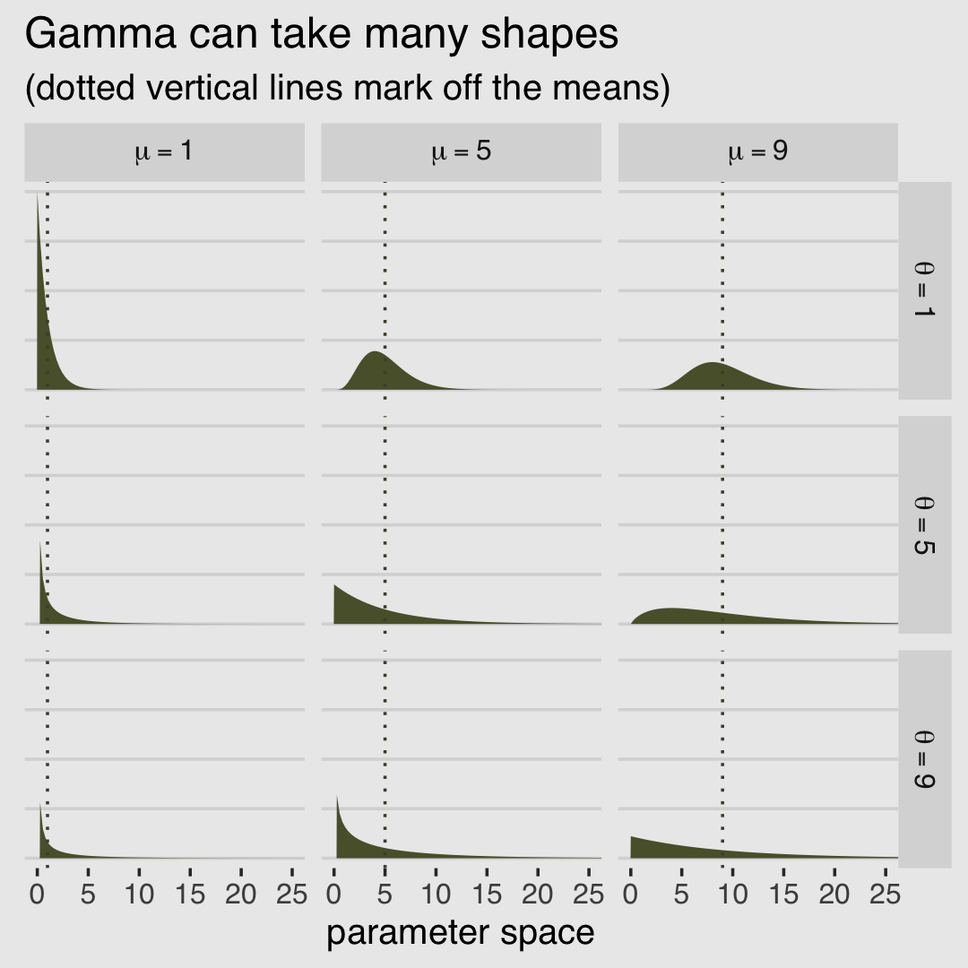 where \(\alpha\) is the shape, \(\theta\) is the scale, \(e\) is base of the natural logarithm, and \(\Gamma\) is the gamma function. And just in case you were worried you life wasn’t complicated enough, the base R dgamma() function will also allow you to define the gamma density with a rate parameter, rather than with scale. As it turns out, the “rate” in this context is just the inverse of the scale. When one parameterizes gamma this way, it follows the formula