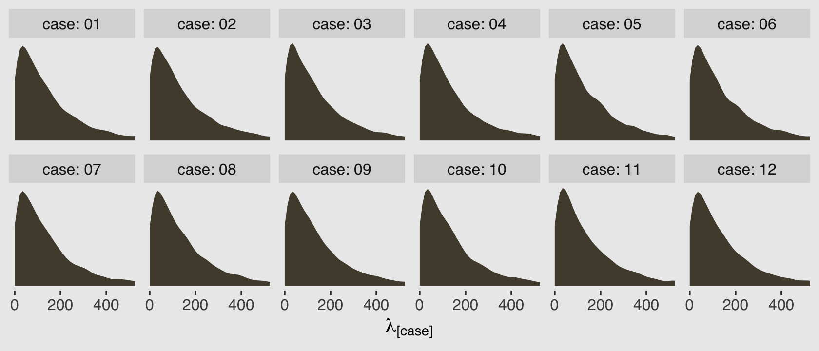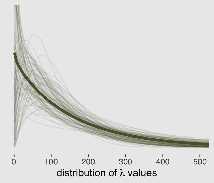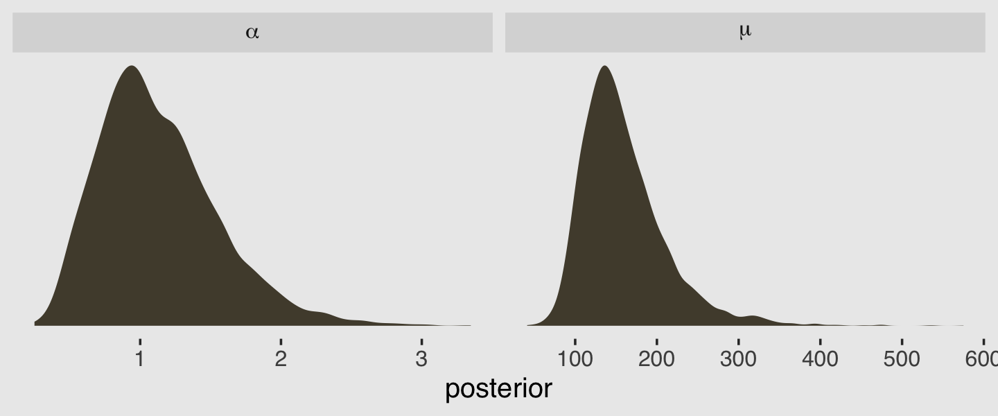 where \(\alpha\), \(e\), and \(\Gamma\) are all as they were before and \(\beta\) is the rate parameter. Let’s say we wanted to use the \(\operatorname{Gamma}(y | \alpha, \theta)\) parameterization with the dgamma() function. Here are the posterior means for our \(\alpha\) and \(\theta\) parameters.