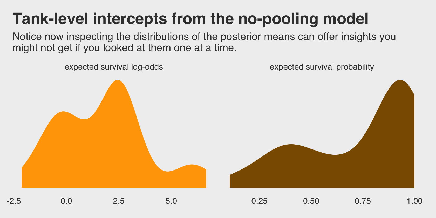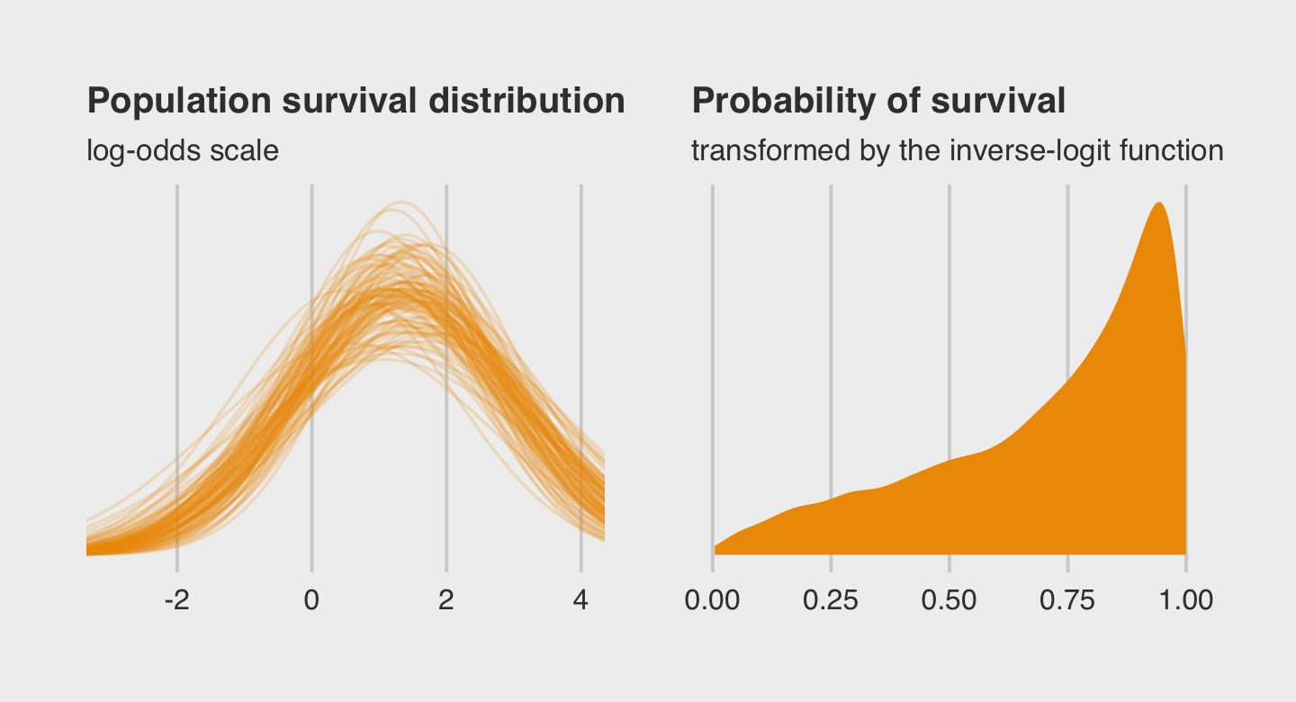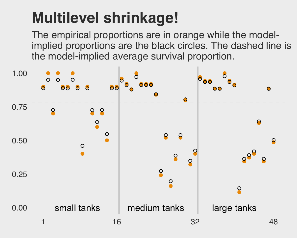 \[\begin{align*} \text{surv}_i & \sim \operatorname{Binomial}(n_i, p_i) \\ \operatorname{logit}(p_i) & = \alpha_{\text{tank}_i} \\ \alpha_{\text{tank}} & \sim \operatorname{Normal}(0, 5), \end{align*}\]