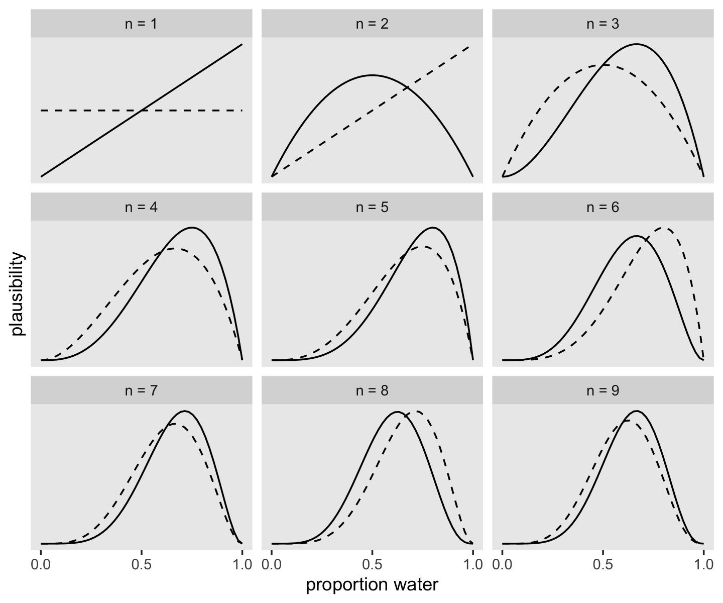 In this chapter, you will begin to build Bayesian models. The way that Bayesian models learn from evidence is arguably optimal in the small world. When their assumptions approximate reality, they also perform well in the large world. But large world performance has to be demonstrated rather than logically deduced. (McElreath, 2015, p. 20)