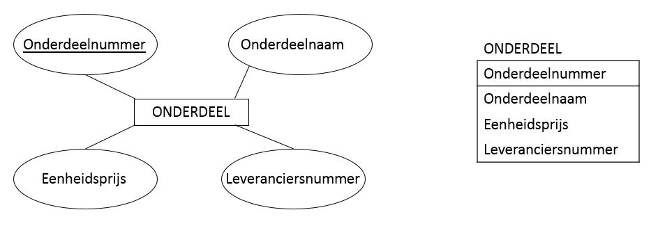 - Volgens de notatie van Chen wordt een entiteit visueel weergegeven door een rechthoek en attributen door een ovaal. De relaties tussen de attributen en de entiteiten worden door lijnen voorgesteld. In onderstaande figuur kan je deze notatie vinden voor de entiteitenklasse ONDERDEEL die we voorheen hebben gezien. De blokstijl, die rechts getoond wordt, is een notatie die momenteel meer gebruikt wordt.