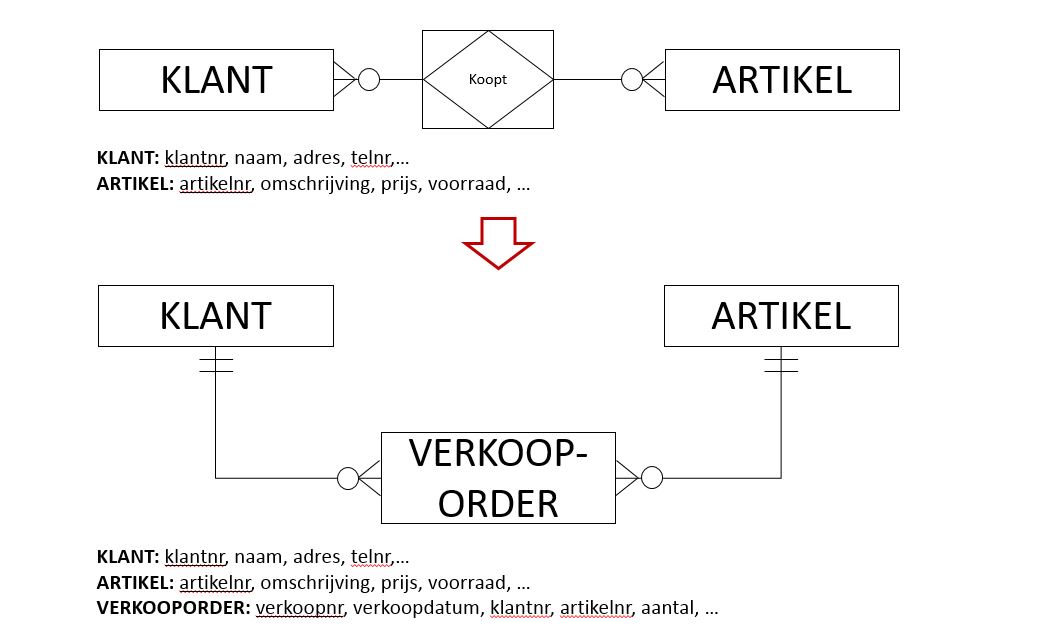 - De ‘relatie’ wordt in dit voorbeeld omgezet in de associatieve entiteit VERKOOPORDER met eigen attributen zoals een verkoopnr, een verkoopdatum, enz. De verkooporder is verbonden met klant en artikel via de relatie-attributen klantnr en artikelnr. De derde (associatieve) entiteit is