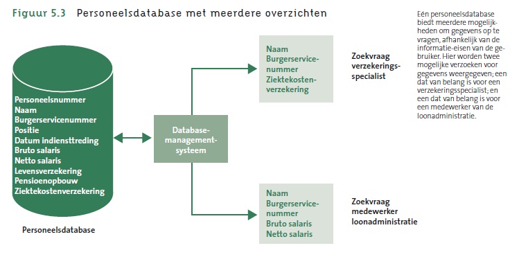 - Het DBMS zorgt ervoor dat, hoewel gegevens op slechts één manier (fysiek) worden opgeslagen en gestructureerd, ze voor verschillende gebruikers op verschillende manieren worden weergegeven (logische weergave). Zie onderstaande figuur voor een visuele weergave van het DBMS-principe (bron: Figuur 5.3 in Laudon & Laudon, 2015).