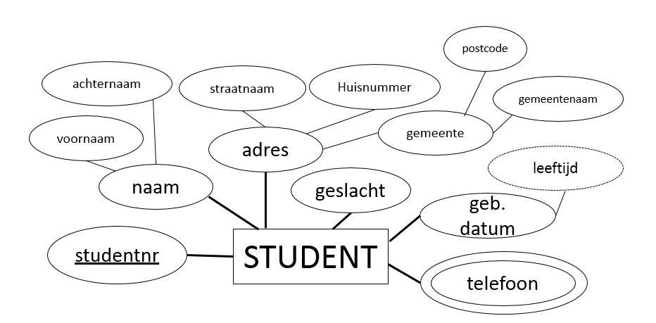 - Enkelvoudige versus samengestelde attributen. Bv.: studentennummer (enkelvoudig), adres (samengesteld uit: straatnaam+huisnr.+postcode+gemeente)