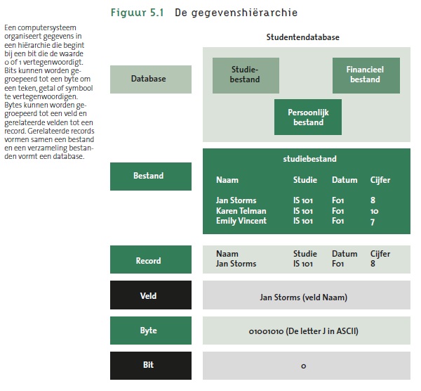 - Gegevens worden opgeslagen in bits (0 of 1), die per 8 een byte vormen. Een combinatie van bytes kan geïnterpreteerd worden als een waarde in een bepaald veld. In het voorbeeld is de naam ‘Jan Storms’ de waarde van het veld ‘Naam’. De waardes van verschillende velden samen, geven een record weer. Het record in het voorbeeld wordt opgemaakt uit de combinatie ‘Jan Storms’, ‘IS 101’, ‘F01’ en ‘8’. Om betekenis aan deze waarden -en dus ook aan het record- te geven, worden de aparte veldnamen (Naam, Studie, Datum en Cijfer) erbij vermeld. Verschillende records samen vormen op hun beurt een bestand, in dit voorbeeld het studiebestand. Het studiebestand, samen met het persoonlijk bestand en het financieel bestand, vormen hier vervolgens een database van studentengegevens.