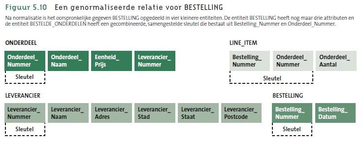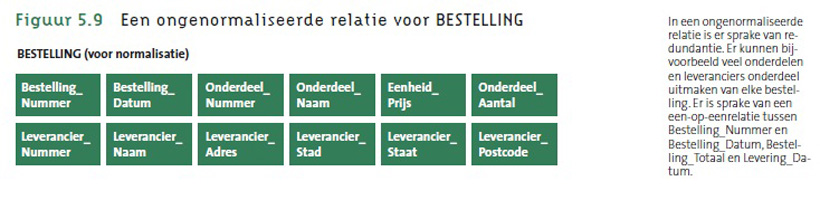- In de bovenstaande dataset worden in elke bestelling gegevens herhaald, bijvoorbeeld de naam en het adres van de leverancier. Daarnaast kan een bestelling herhalende groepen bevatten omdat er verschillende producten in een bestelling kunnen staan. Dit resulteert in data-redundantie (overtolligheid) en inconsistentie (foutieve waarden bij wijzigingen). Om deze problemen te vermijden, worden de herhalende groepen in aparte tabellen geplaatst. Dit opsplitsen van gegevens in groepen van bij elkaar horende gegevens opdat zo weinig mogelijk problemen veroorzaakt kunnen worden, wordt normalisatie genoemd.