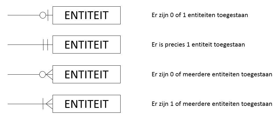 - Voor de notatie van de kardinaliteiten maken we gebruik van de ‘Crow’s foot notation’, oftwel het kraaienpootmodel. Bij elke entiteit worden 2 symbolen getekend: 1 symbool voor de aanduiding van de minimumkardinaliteit en 1 symbool voor de aanduiding van de maximumkardinaliteit.