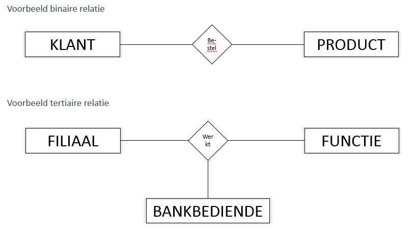 - In onderstaande figuur vind je een voorbeeld van zowel een relatie van de tweede graad (een binaire relatie), als een relatie van de derde graad (een tertiaire relatie).