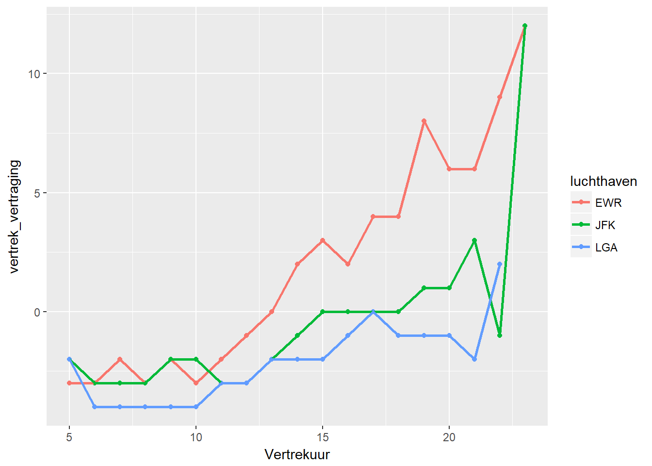 ggplot(data, aes(x=hour(datum), y=vertrek_vertraging, color=luchthaven)) +