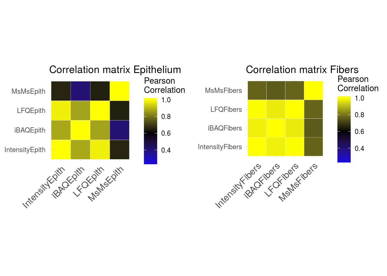 Several quantitative values are available in the dataset to quantify protein levels: Intensity, iBAQ, LFQ and MsMs. I wanted to check the correlation of these values: