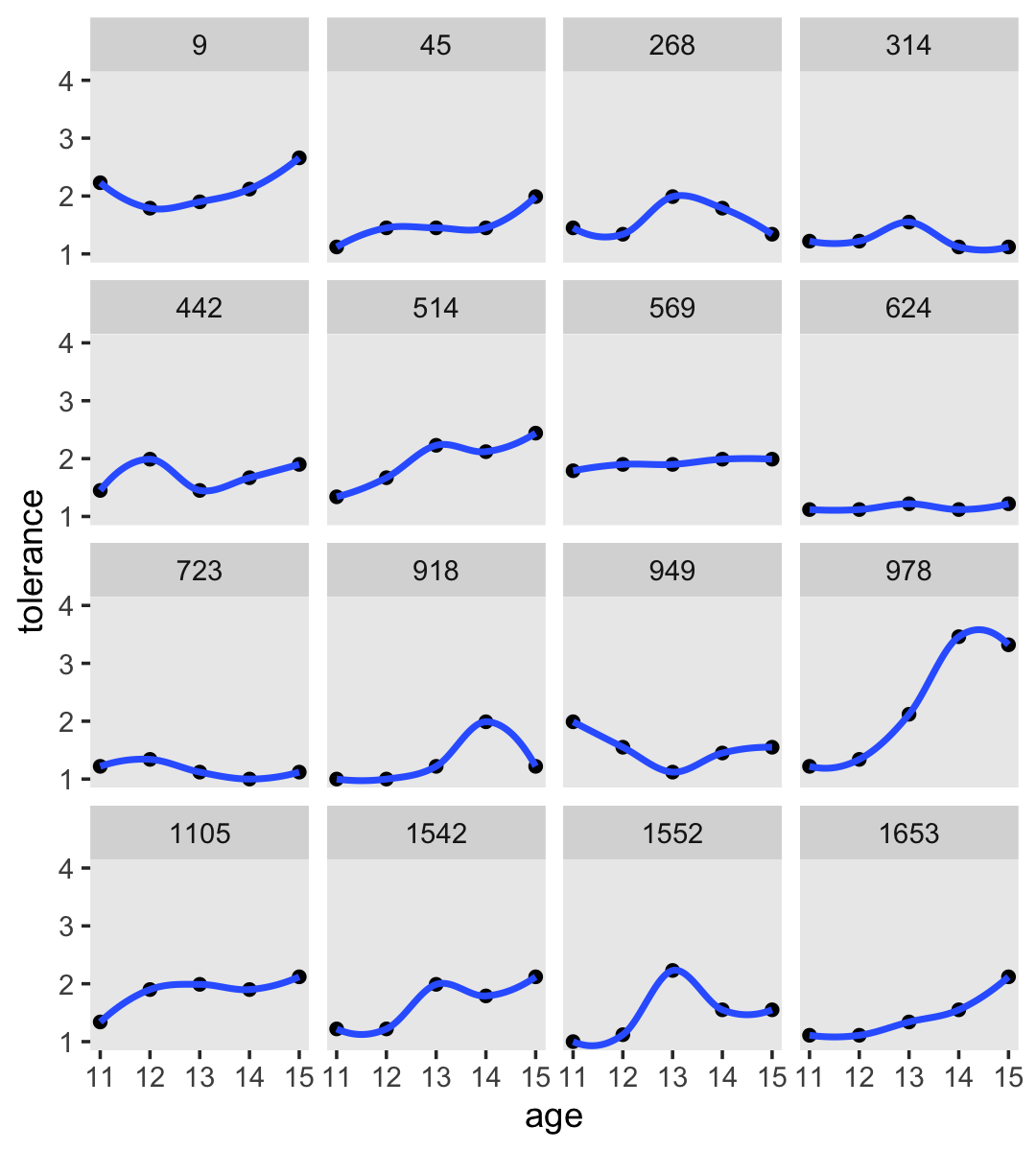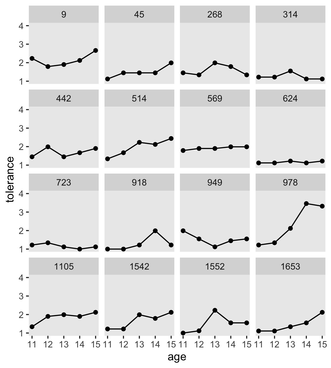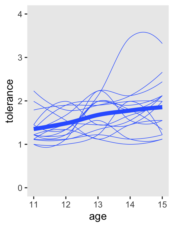 Wise researchers conduct descriptive exploratory analyses of their data before fitting statistical models. As when working with cross-sectional data, exploratory analyses of longitudinal data con reveal general patterns, provide insight into functional form, and identify individuals whose data do not conform to the general pattern. The exploratory analyses presented in this chapter are based on numerical and graphical strategies already familiar from cross-sectional work. Owing to the nature of longitudinal data, however, they are inevitably more complex in this new setting. (Singer & Willett, 2003, p. 16)