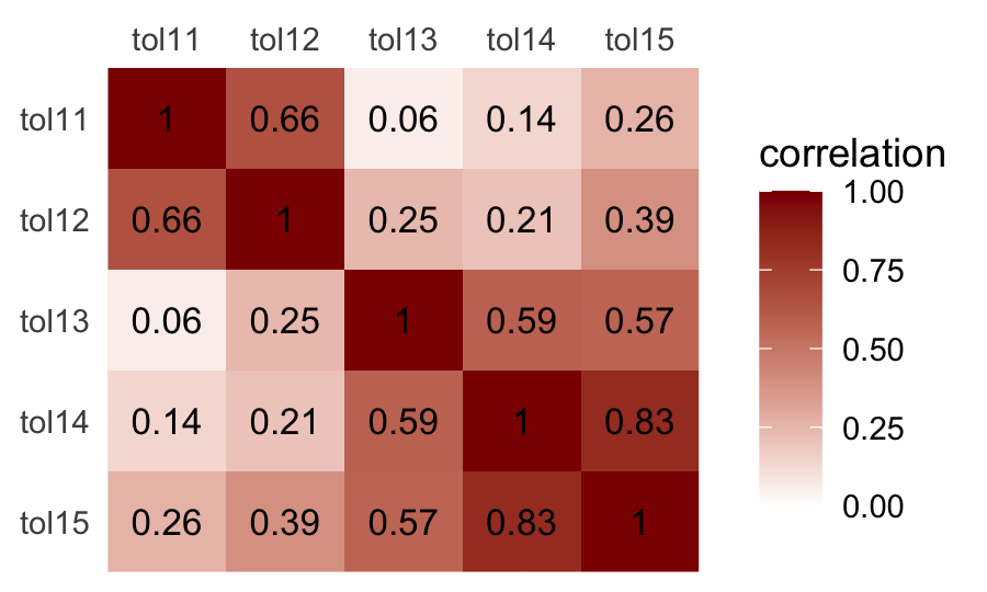 psych::lowerCor(tolerance[ , 2:6])## tol11 tol12 tol13 tol14 tol15