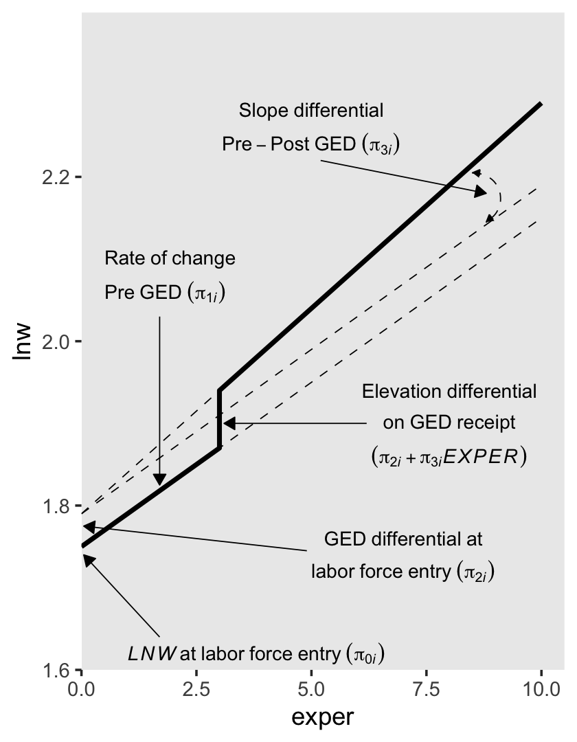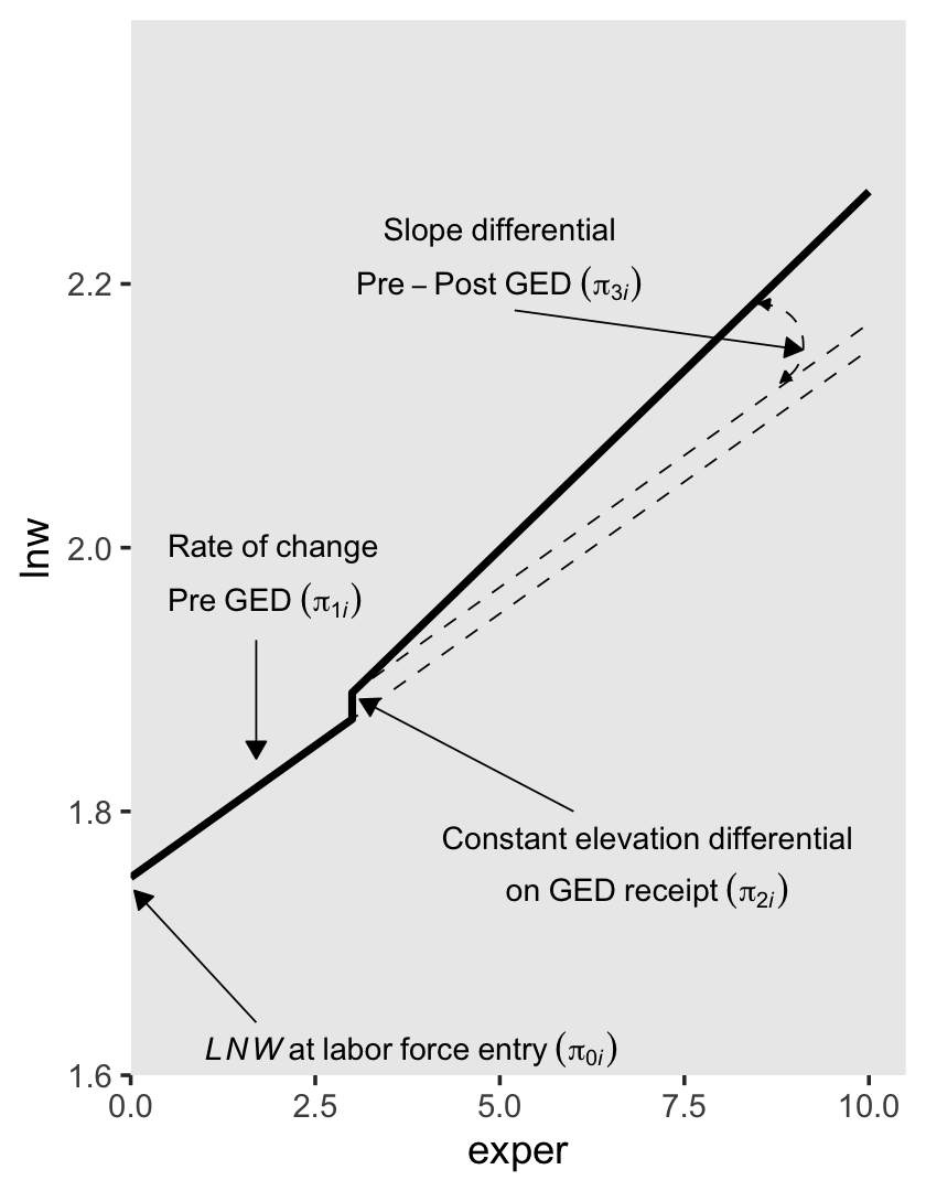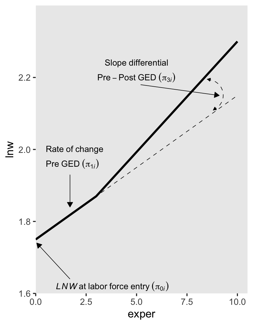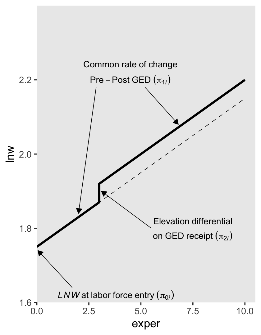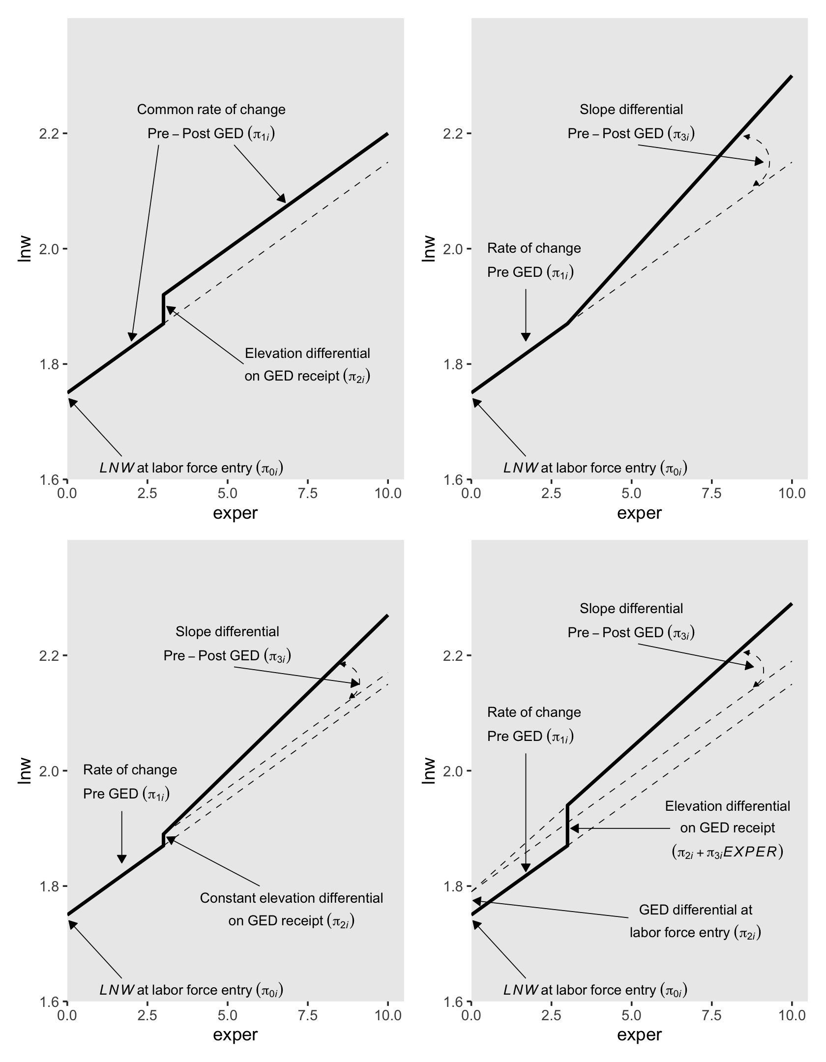 One might wonder: “How might GED receipt affect individual \(i\)’s wage trajectory?” (p. 193). Here we reproduce Figure 6.1, which entertains four possibilities.