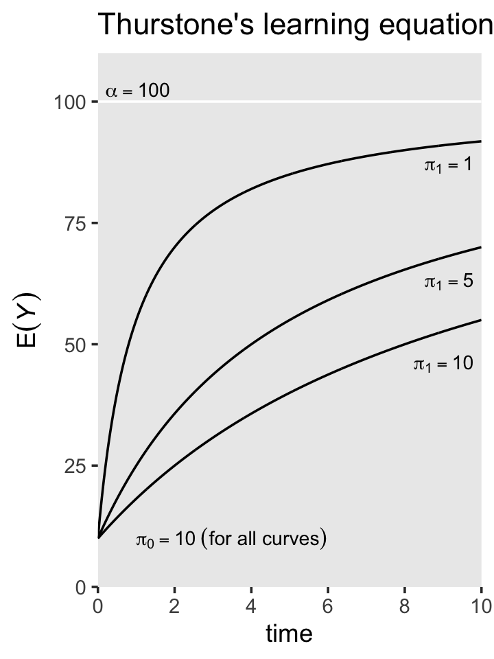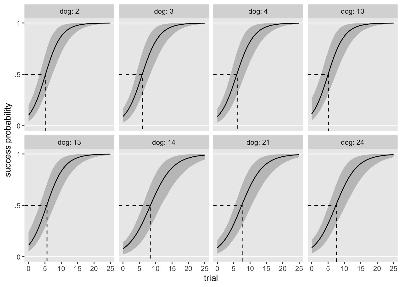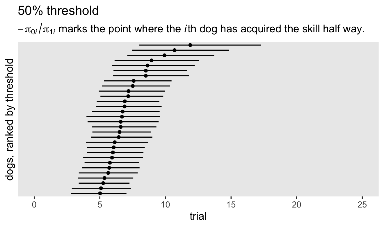 subtitle = expression(-pi[0][italic(i)]/pi[1][italic(i)]*" marks the point where the "*italic(i)*"th dog has acquired the skill half way."),