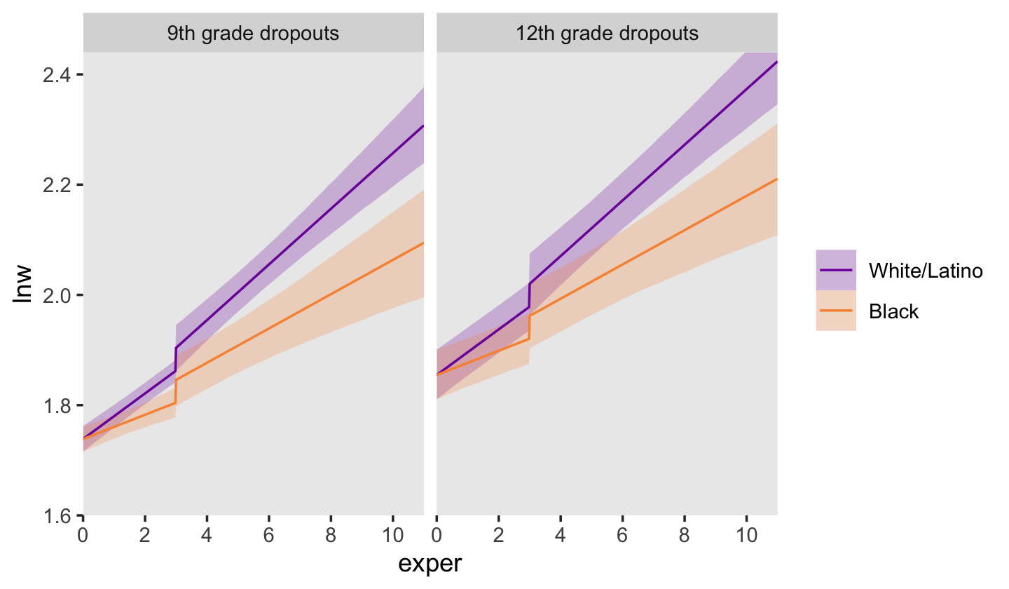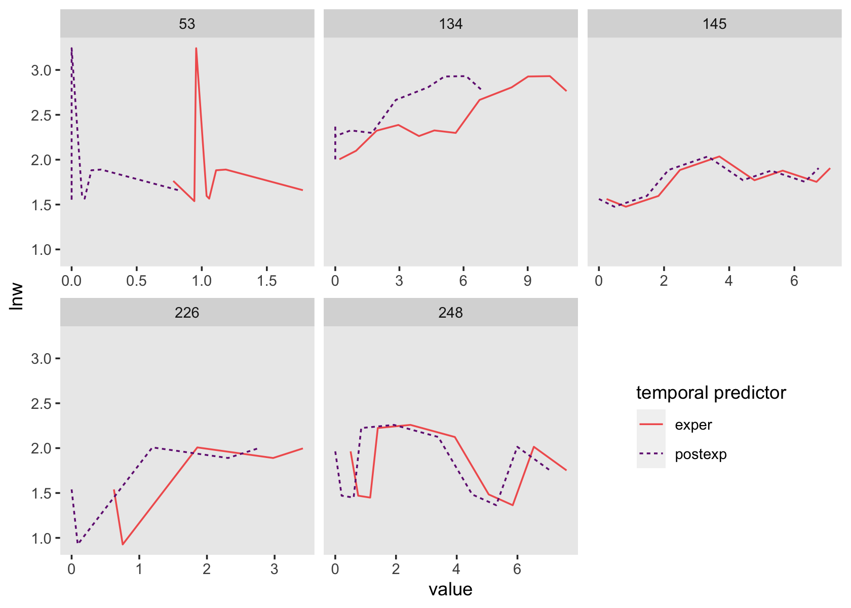 Similar to what we did in Section 5.2.1, here is a visualization of the two primary variables, exper and lnw, for those three participants.