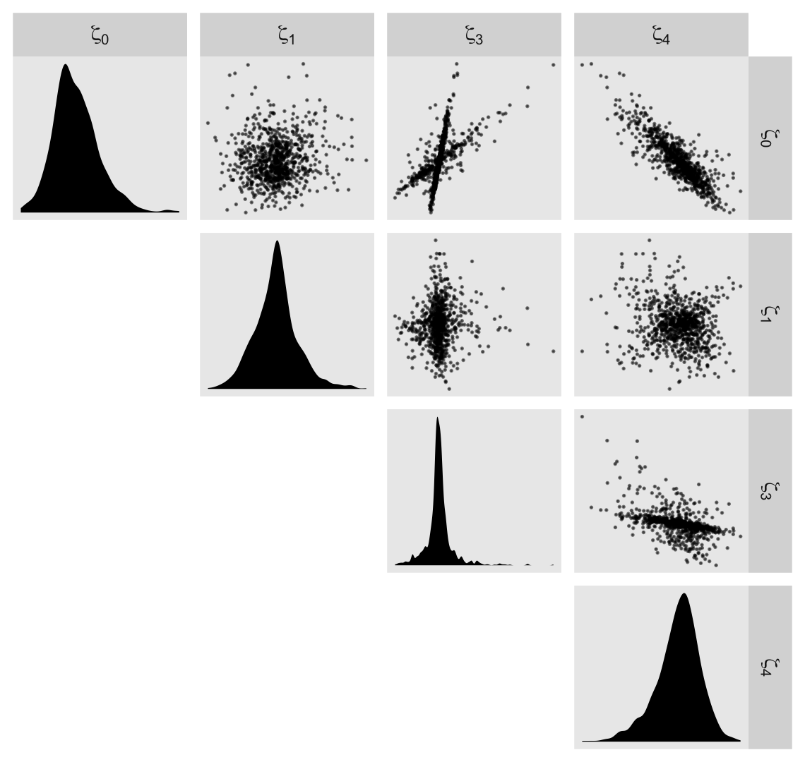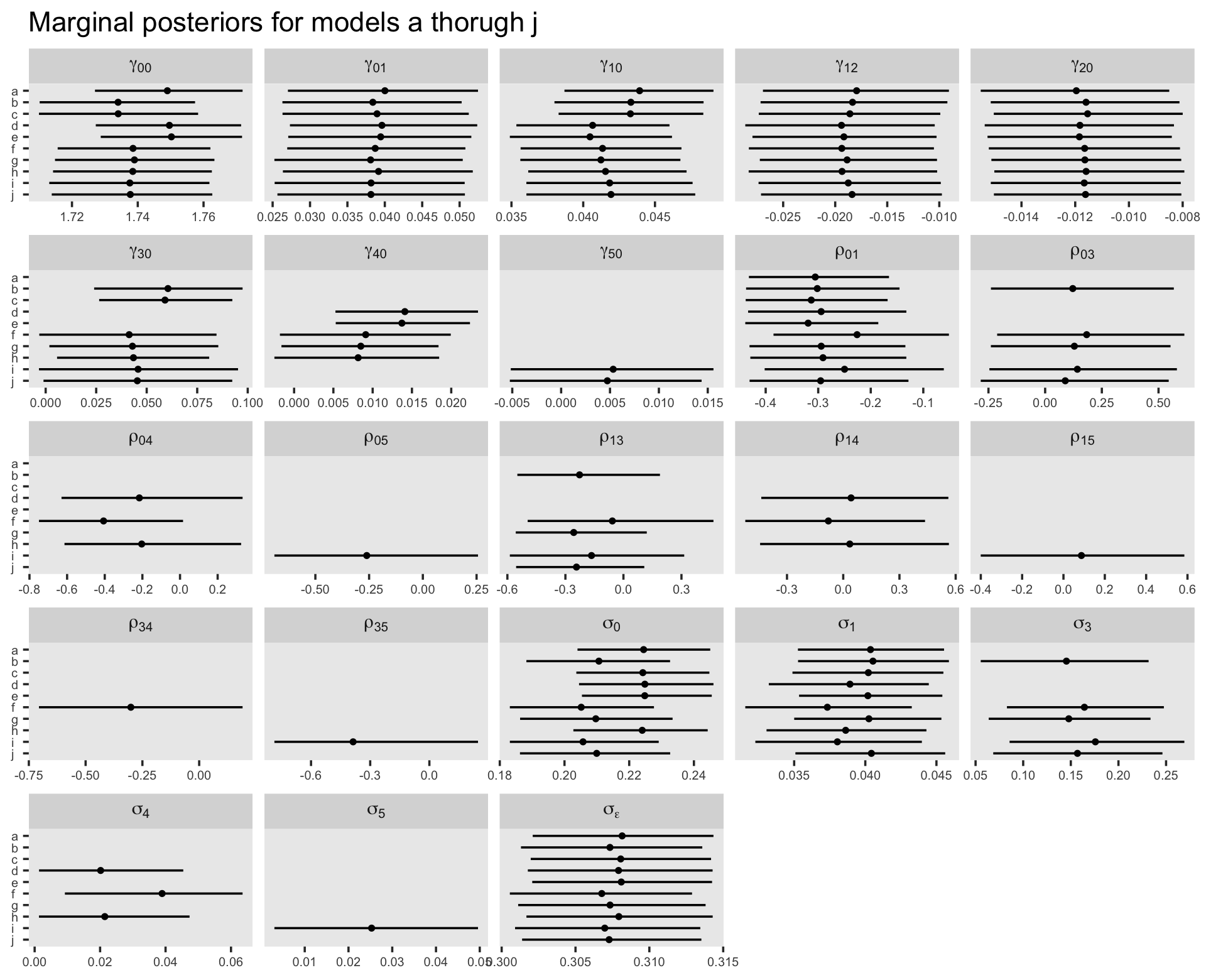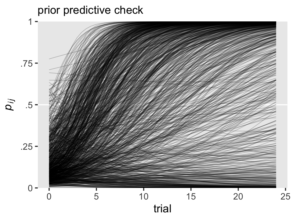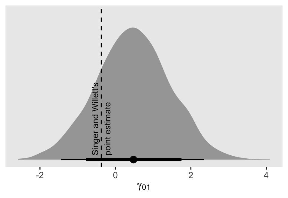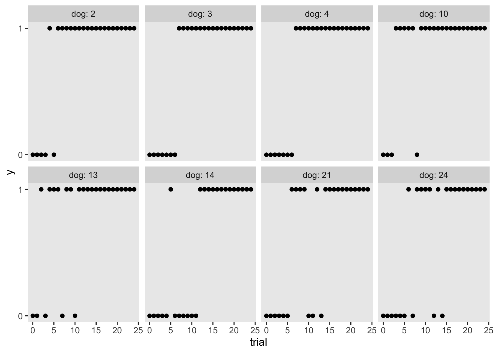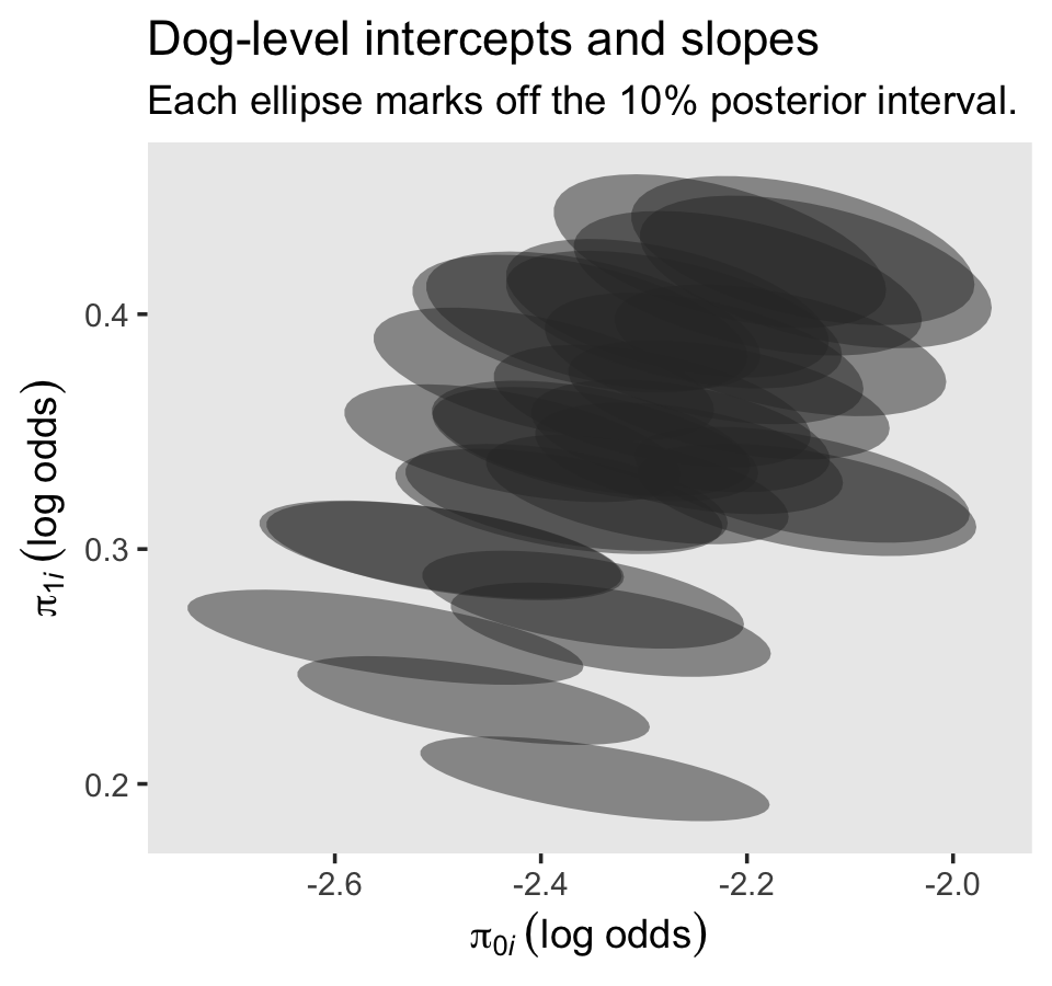 The full bivariate posterior for each dog’s \(\pi\)’s is wider than we’ve depicted with our little 10% ellipses. But even those ellipses give you a sense of their distributions better than simple posterior mean points. It can be hard to interpret these, directly, since both the axes are on the log-odds scale. But hopefully you can at least get a sense of two things: There’s more variability across the \(\pi_{0i}\) parameters than across the \(\pi_{1i}\) parameters (look at the ranges in the axes). Also, there is more variability within the \(\pi_{0i}\) parameters than within the \(\pi_{1i}\) parameters (look at the shapes of the ellipses, themselves). This is the essence of the posterior means and standard deviations of the level-2 \(\sigma\) parameters.