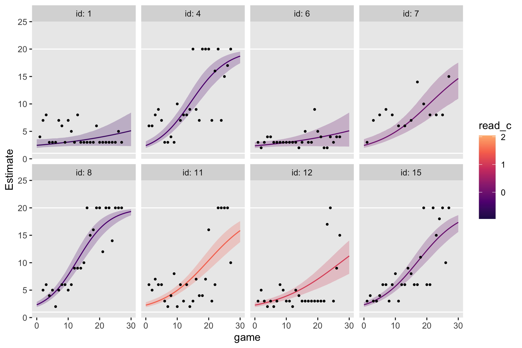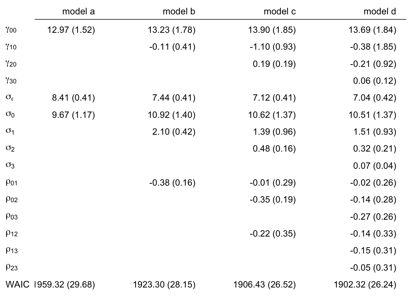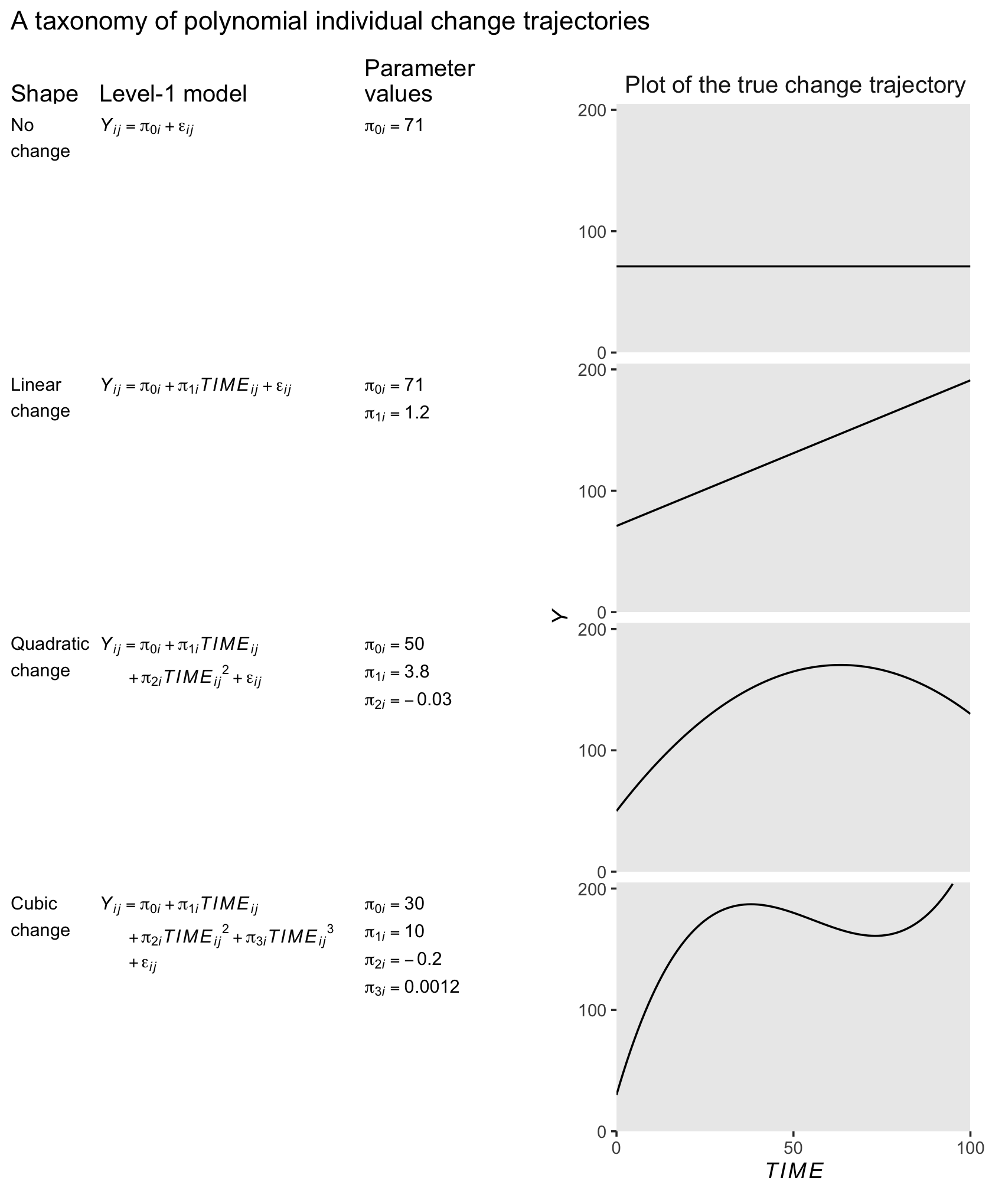 If you have reason to believe that individual change trajectories might shift in elevation and/or slope, your level-1 model should reflect this hypothesis. Doing so allows you to test ideas about how the trajectory’s shape might change over time…