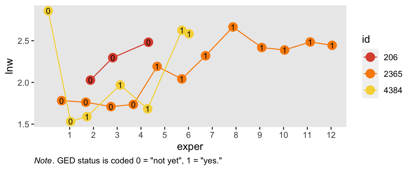 Note how the time-varying predictor ged is depicted as either an 0 or a 1 in the center of the dots. Maybe we might describe that change as linear with the simple model \(\text{lnw}_{ij} = \pi_{0i} + \pi_{1i} \text{exper}_{ij} + \epsilon_{ij}\). Maybe a different model that included ged would be helpful.