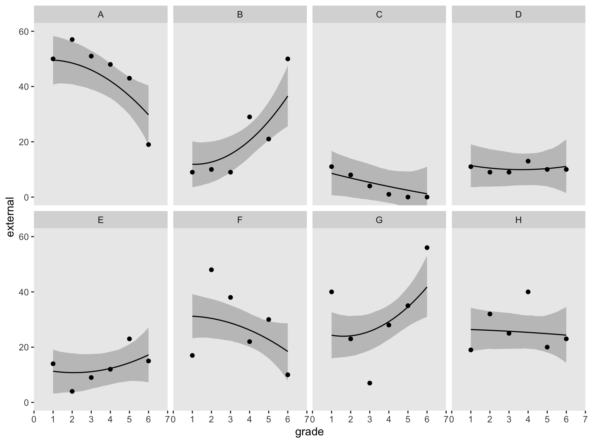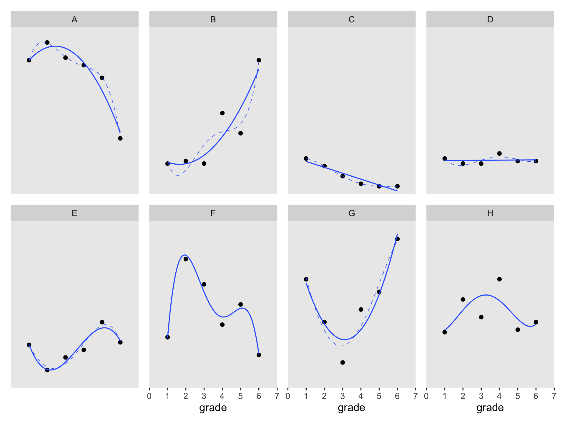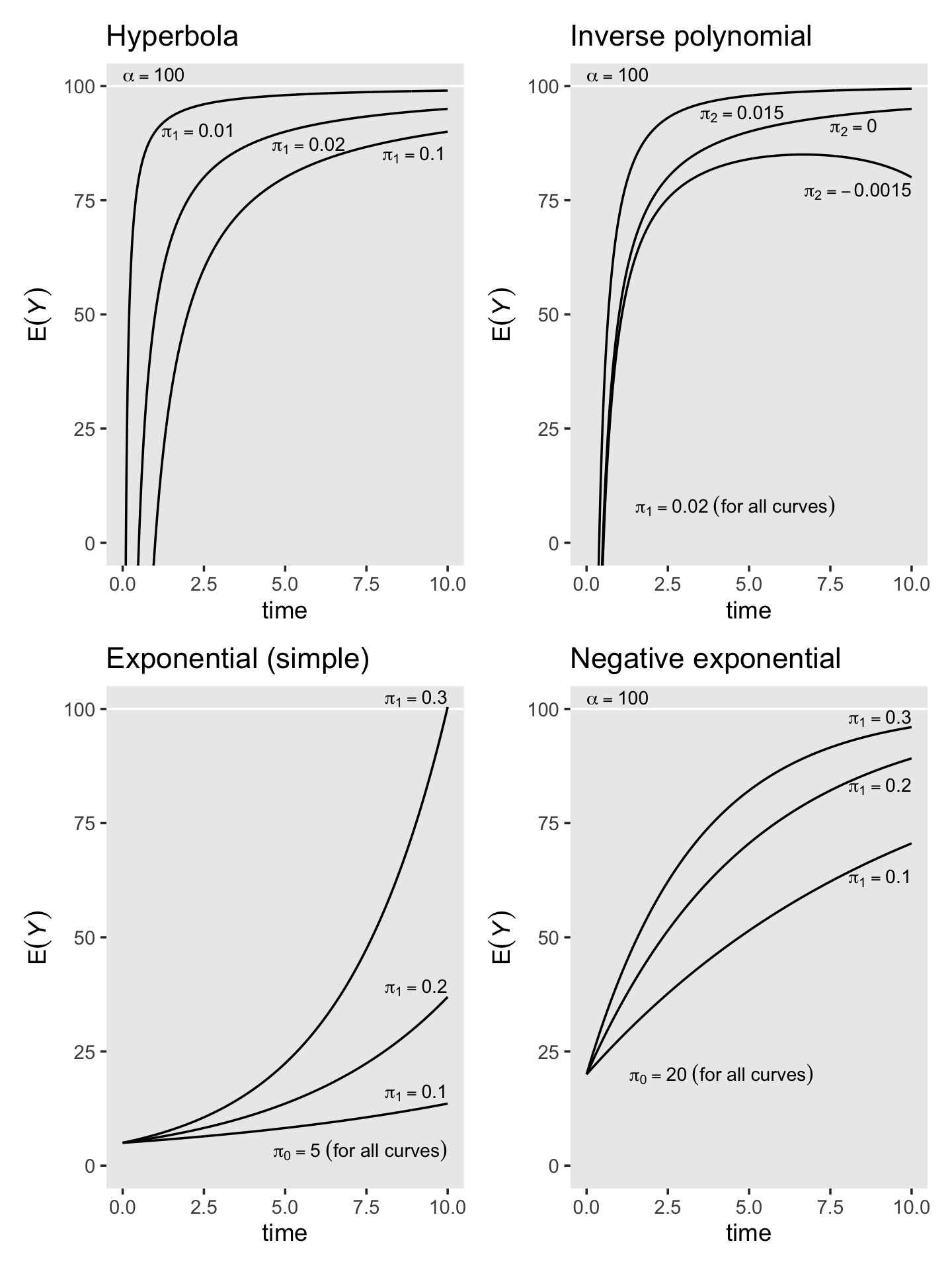In this chapter, we introduce strategies for fitting models in which individual change is explicitly discontinuous or nonlinear. Rather than view these patterns as inconveniences, we treat them as substantively compelling opportunities. In doing so, we broaden our questions about the nature of change beyond the basic concepts of initial status and rate of change to a consideration of acceleration, deceleration, turning points, shifts, and asymptotes. The strategies that we use fall into two broad classes. Empirical strategies that let the “data speak for themselves.” Under this approach, you inspect observed growth records systematically and identify a transformation of the outcome, or of TIME, that linearizes the individual change trajectory. Unfortunately, this approach can lead to interpretive difficulties, especially if it involves esoteric transformations or higher order polynomials. Under rational strategies, on the other hand, you use theory to hypothesize a substantively meaningful functional form for the individual change trajectory. Although rational strategies generally yield clearer interpretations, their dependence on good theory makes them somewhat more difficult to develop and apply. (Singer & Willett, 2003, pp. 189–190, emphasis in the original)