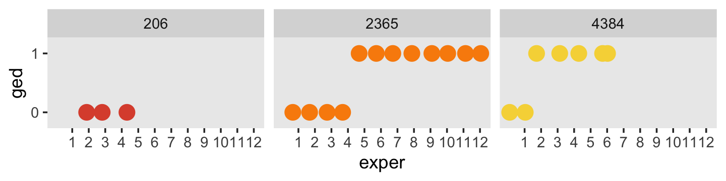 Here’s another, more focused, look at the GED status for our three focal participants, over exper.