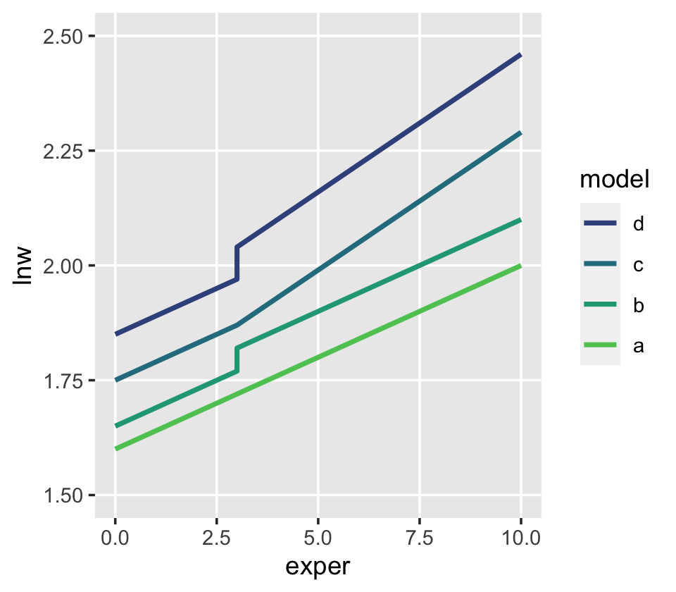 model == "d" ~ 1.85 + 0.04 * exper + 0.01 * ged + 0.02 * exper * ged
