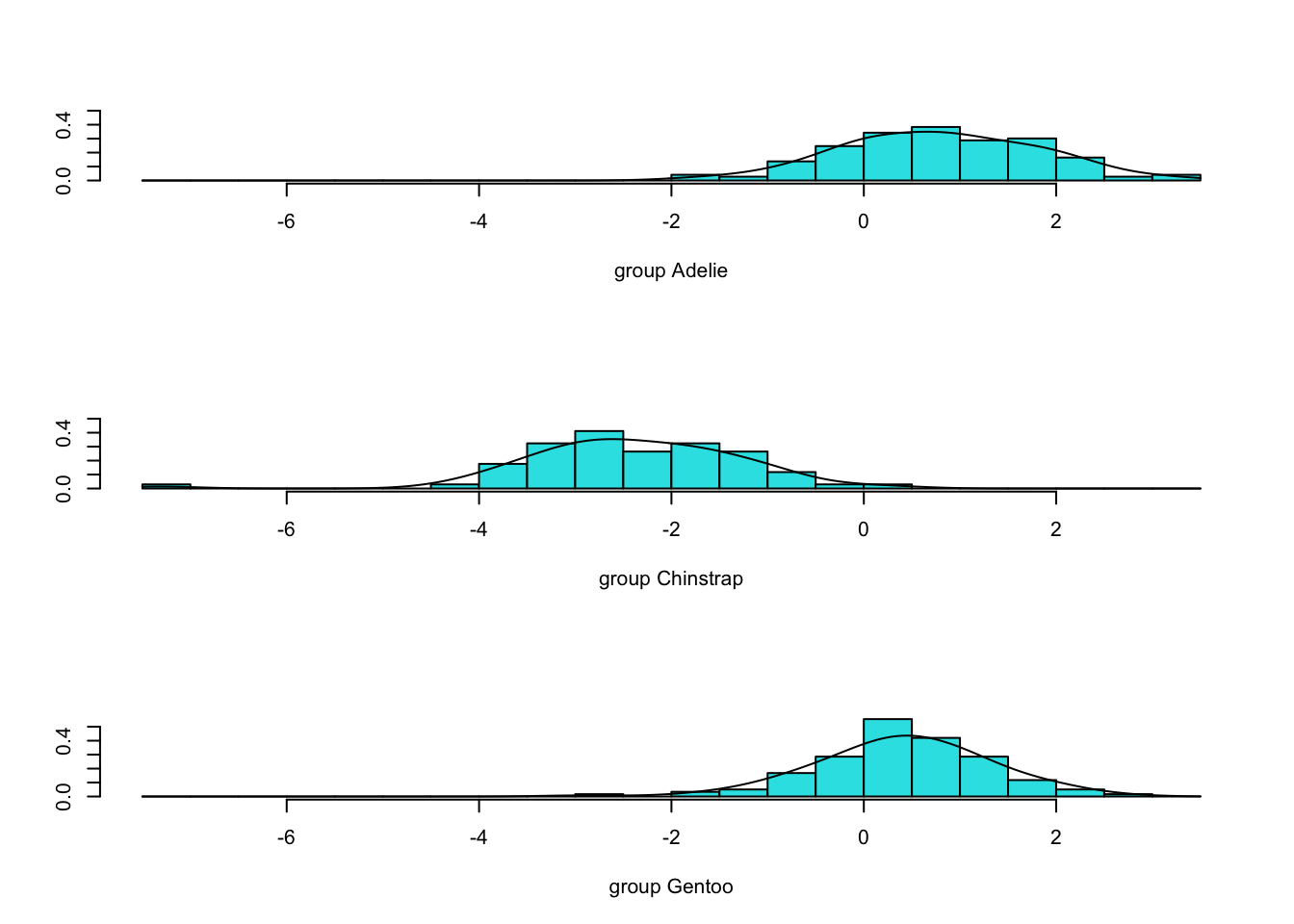 - We chose ‘Adelie’ as the reference group because it was listed first in alphabetical order.