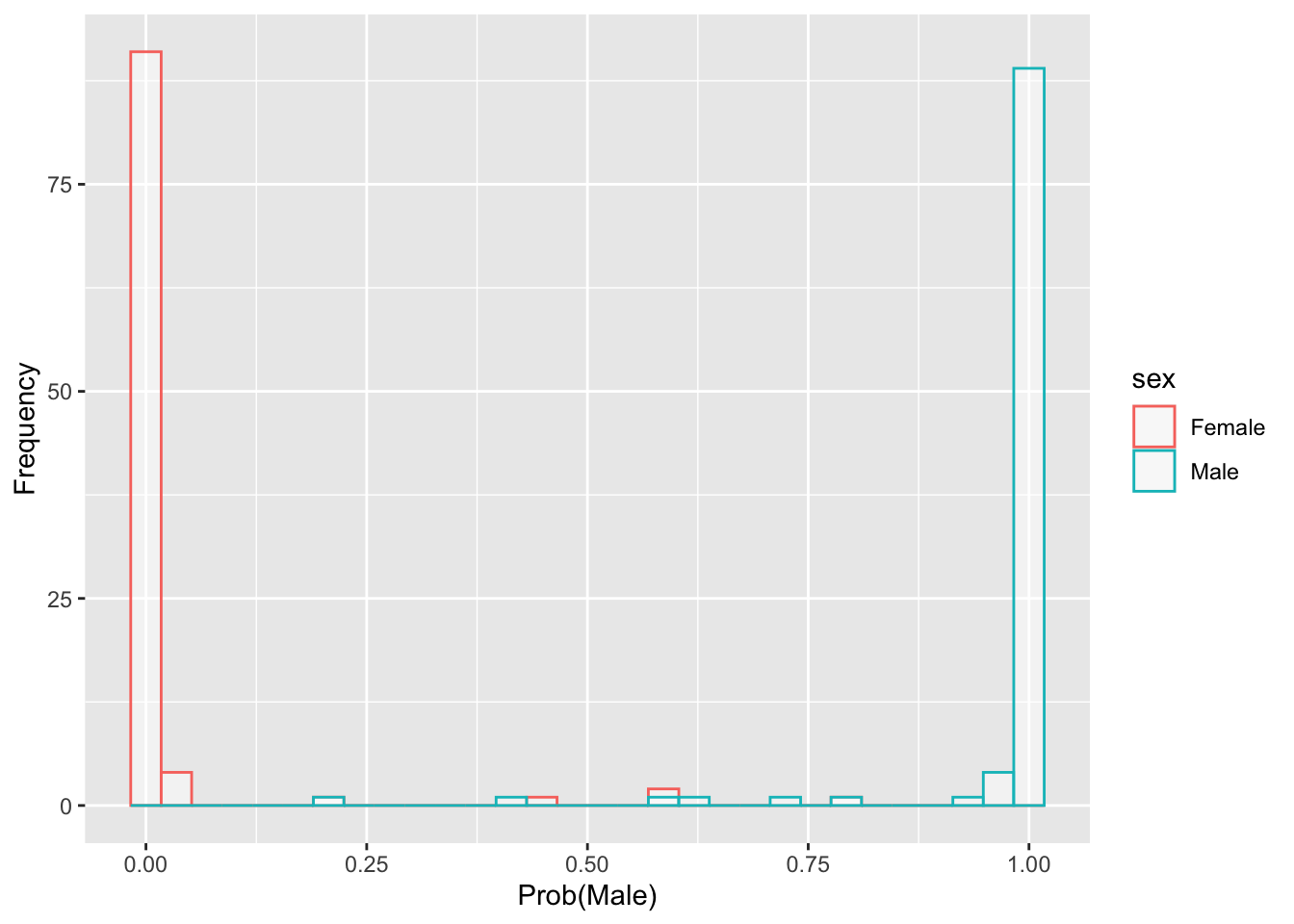 gg <- ggplot(df, aes(x=prob, color=sex)) + geom_histogram(fill="white", alpha=0.5, position="identity") + labs(x="Prob(Male)",y='Frequency')Code
