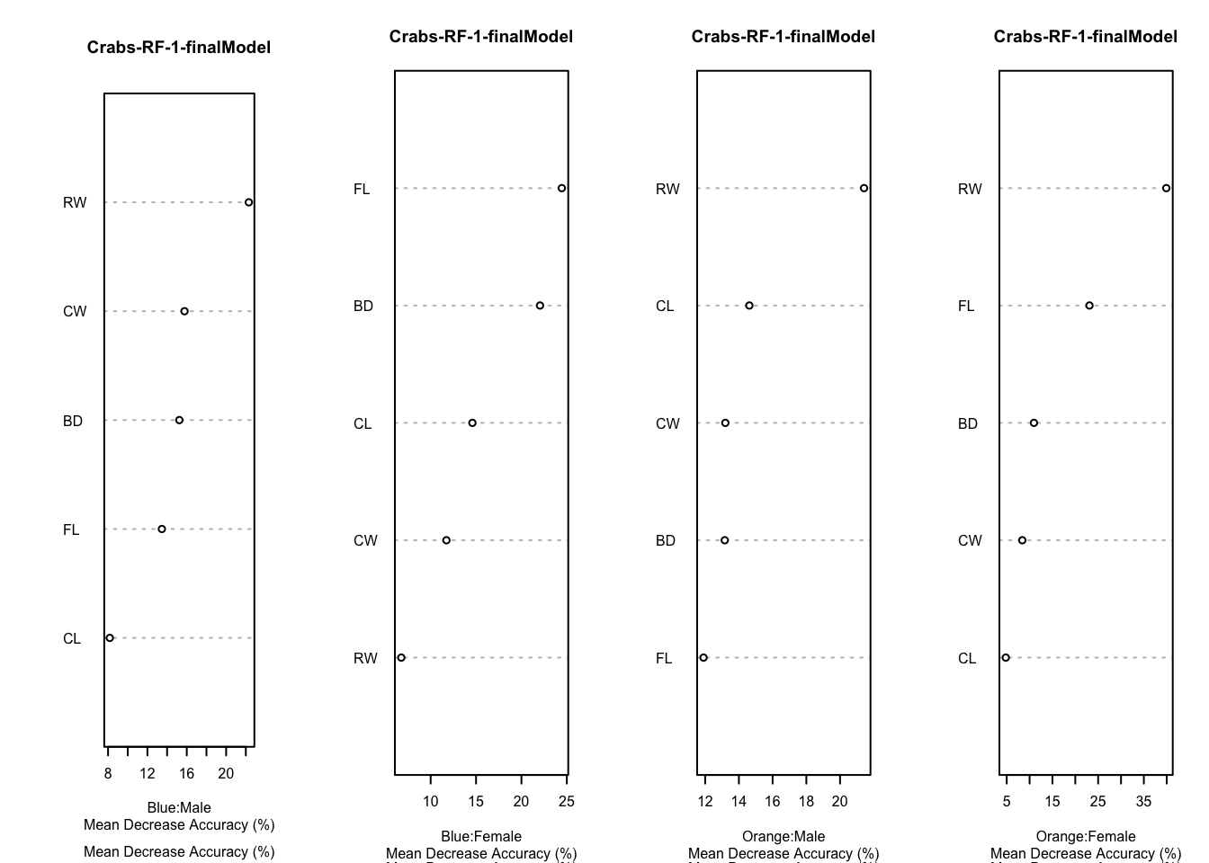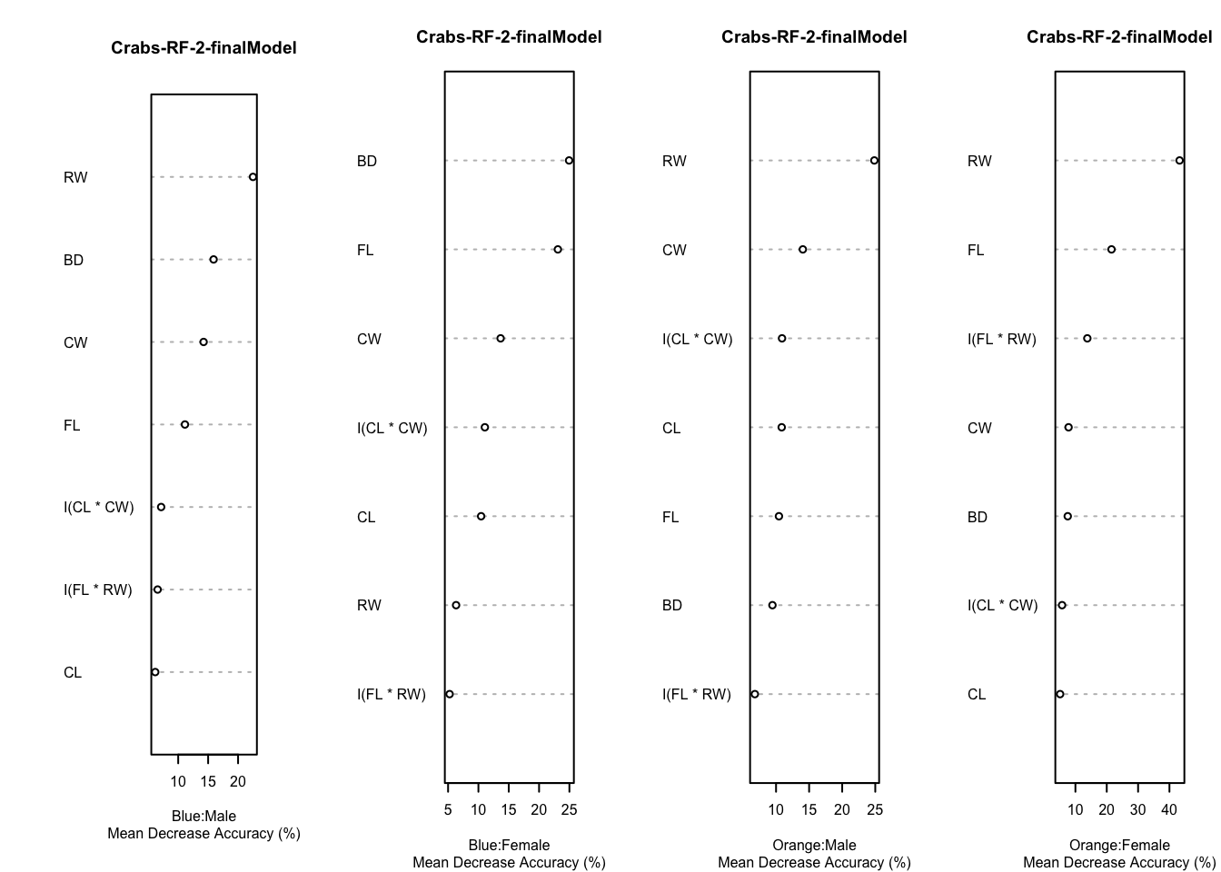 text.nn.crabs.2 <- capture.output(nn.crabs.2 <- caret::train(group~FL+RW+CL+CW+BD+I(FL*RW)+I(CL*CW), data=training, method = "nnet", metric = "Accuracy", trControl = trControl, tuneGrid = tuneGrid, importance = TRUE))