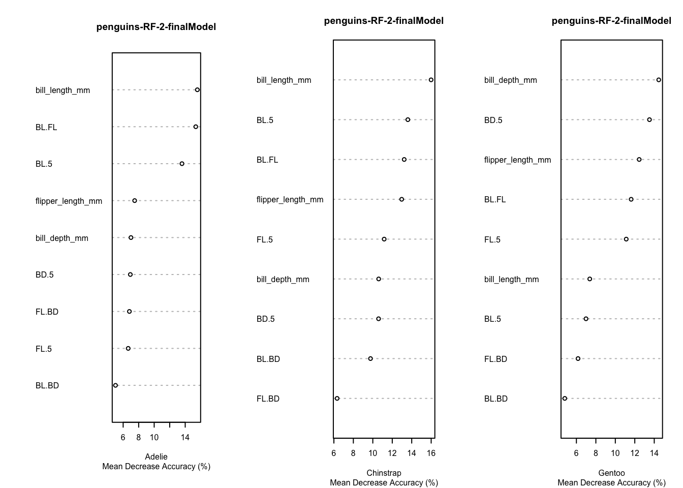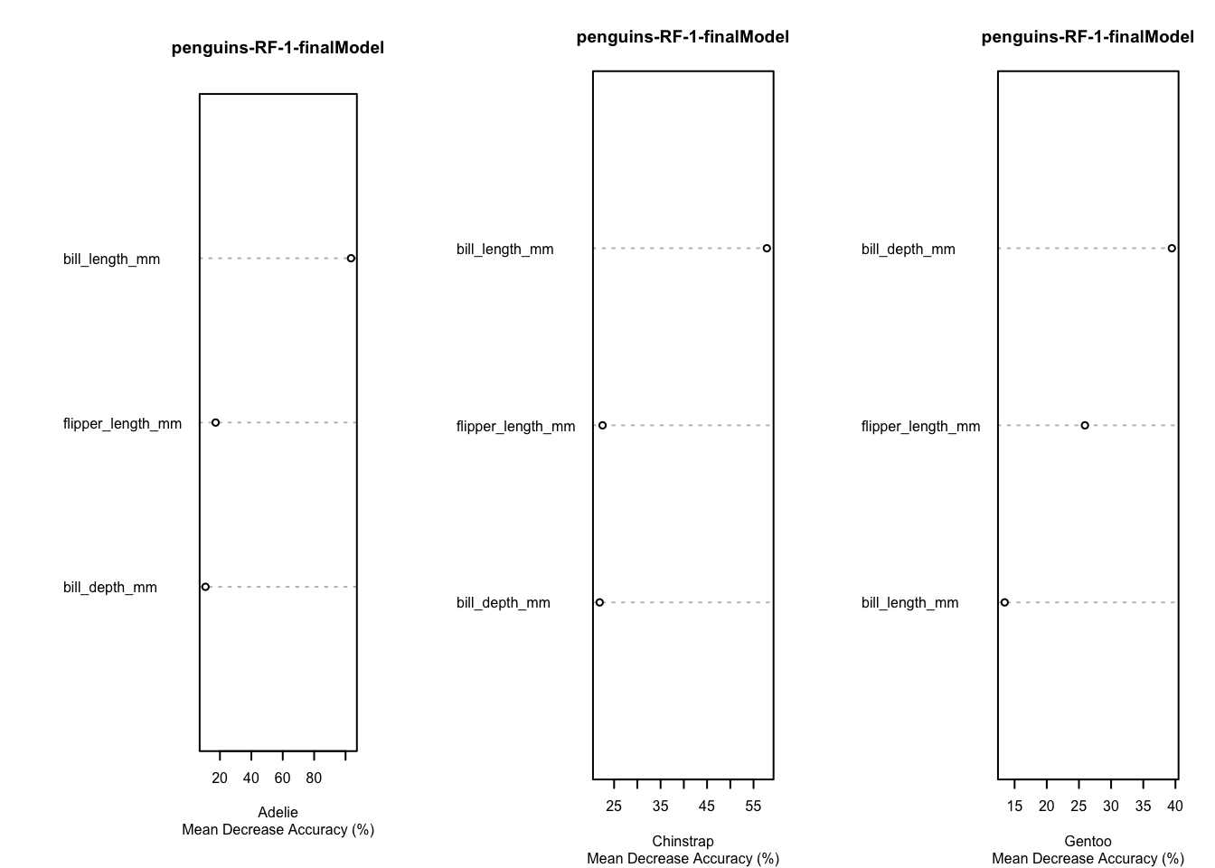 rf.penguins.1 <- caret::train(species ~ bill_length_mm+bill_depth_mm+flipper_length_mm, data=training, method = "rf", metric = "Accuracy", trControl = trControl,importance = TRUE,ntree=300)## note: only 2 unique complexity parameters in default grid. Truncating the grid to 2 .