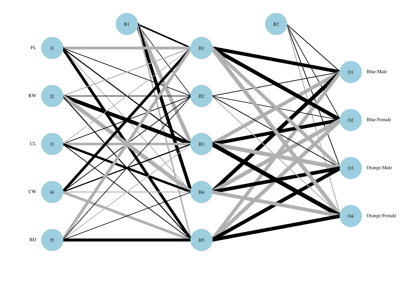 plotnet(nn.crabs.1$finalModel, cex_val=.5)