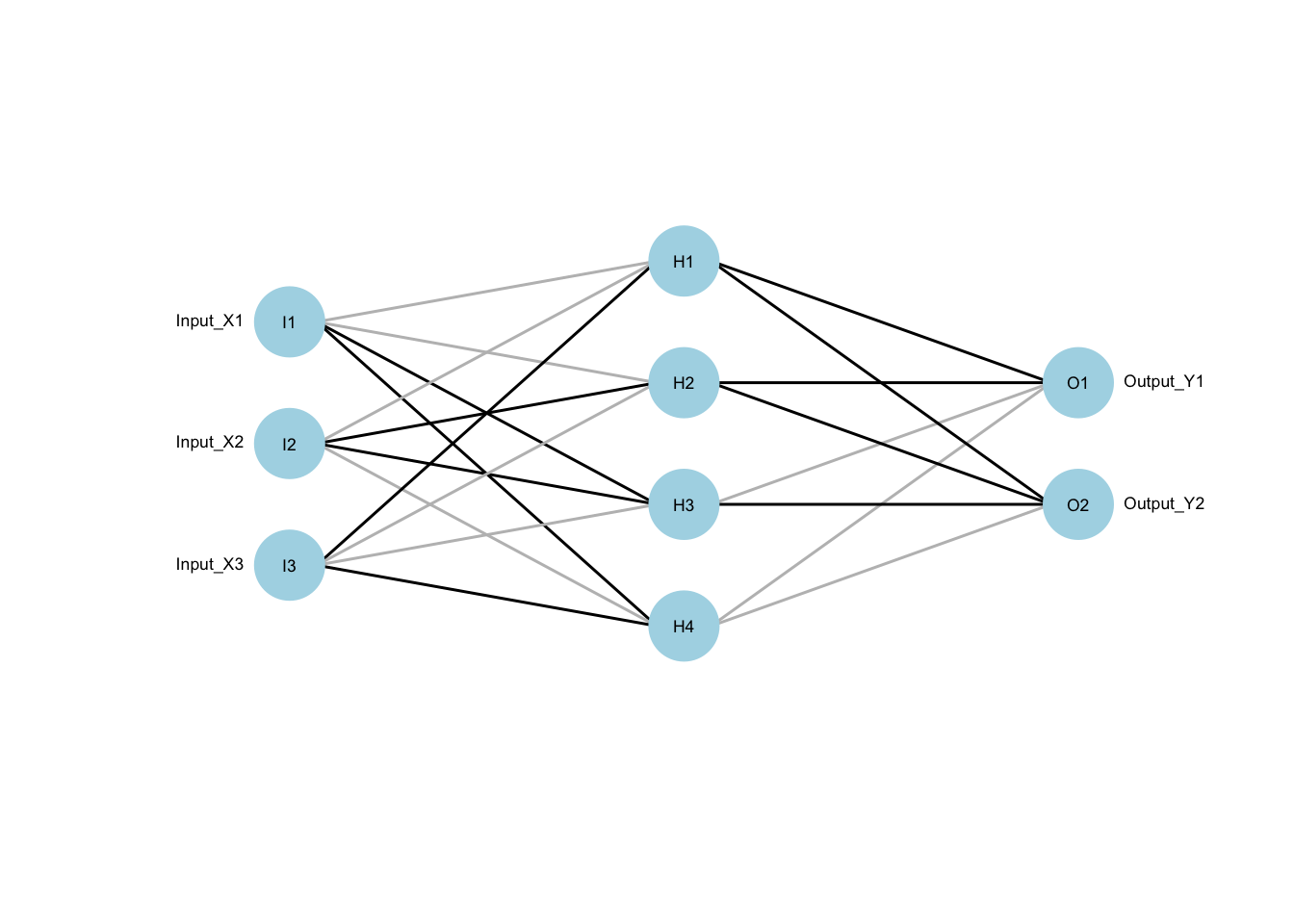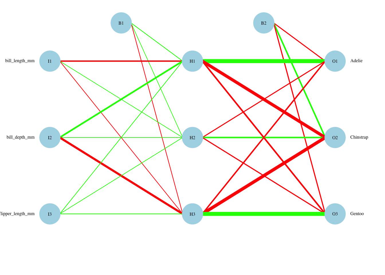 While it is difficult to interpret this network, we can see that all nodes in the hidden layer play some role both from the original feature set to the output layer.
