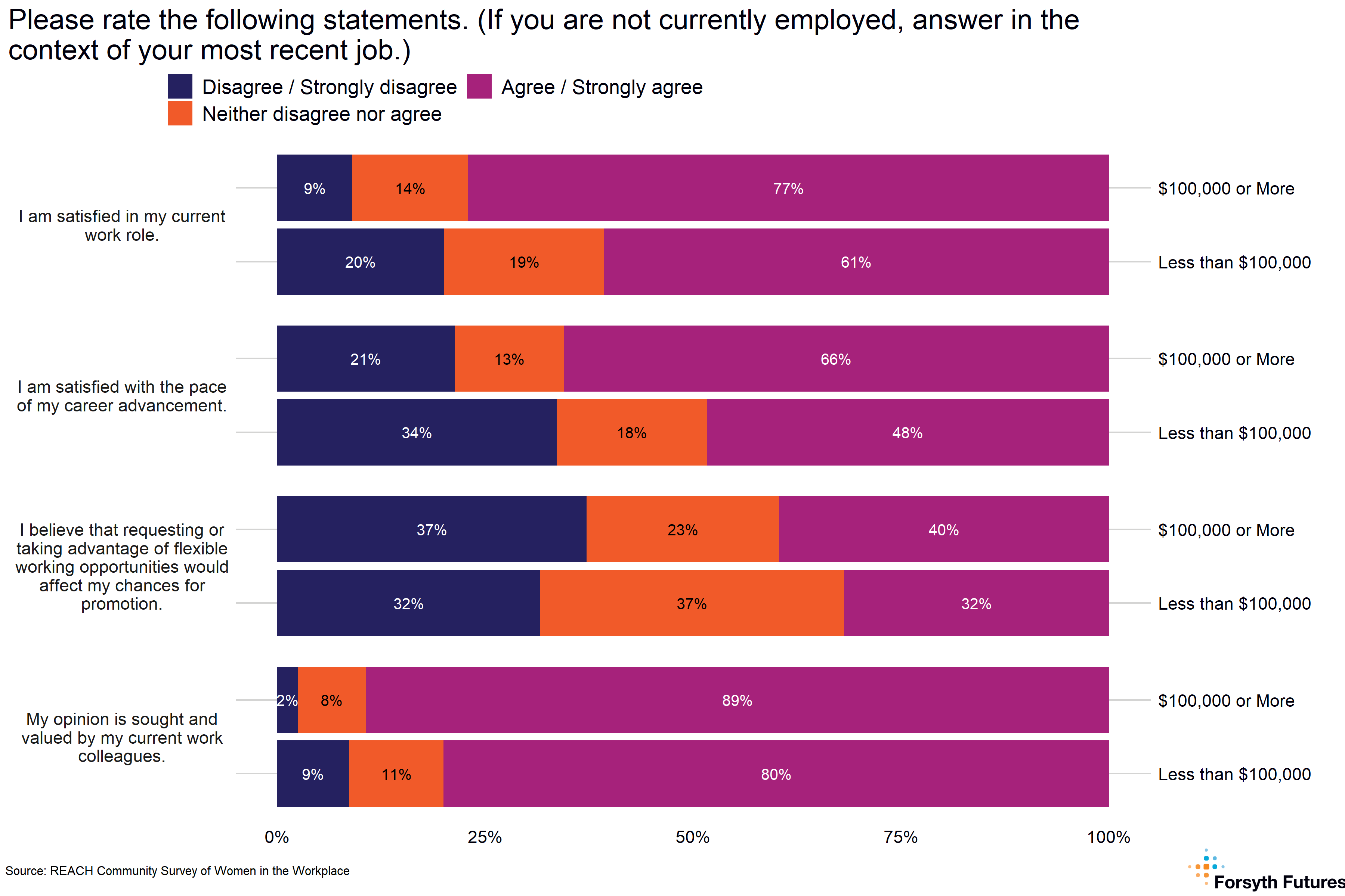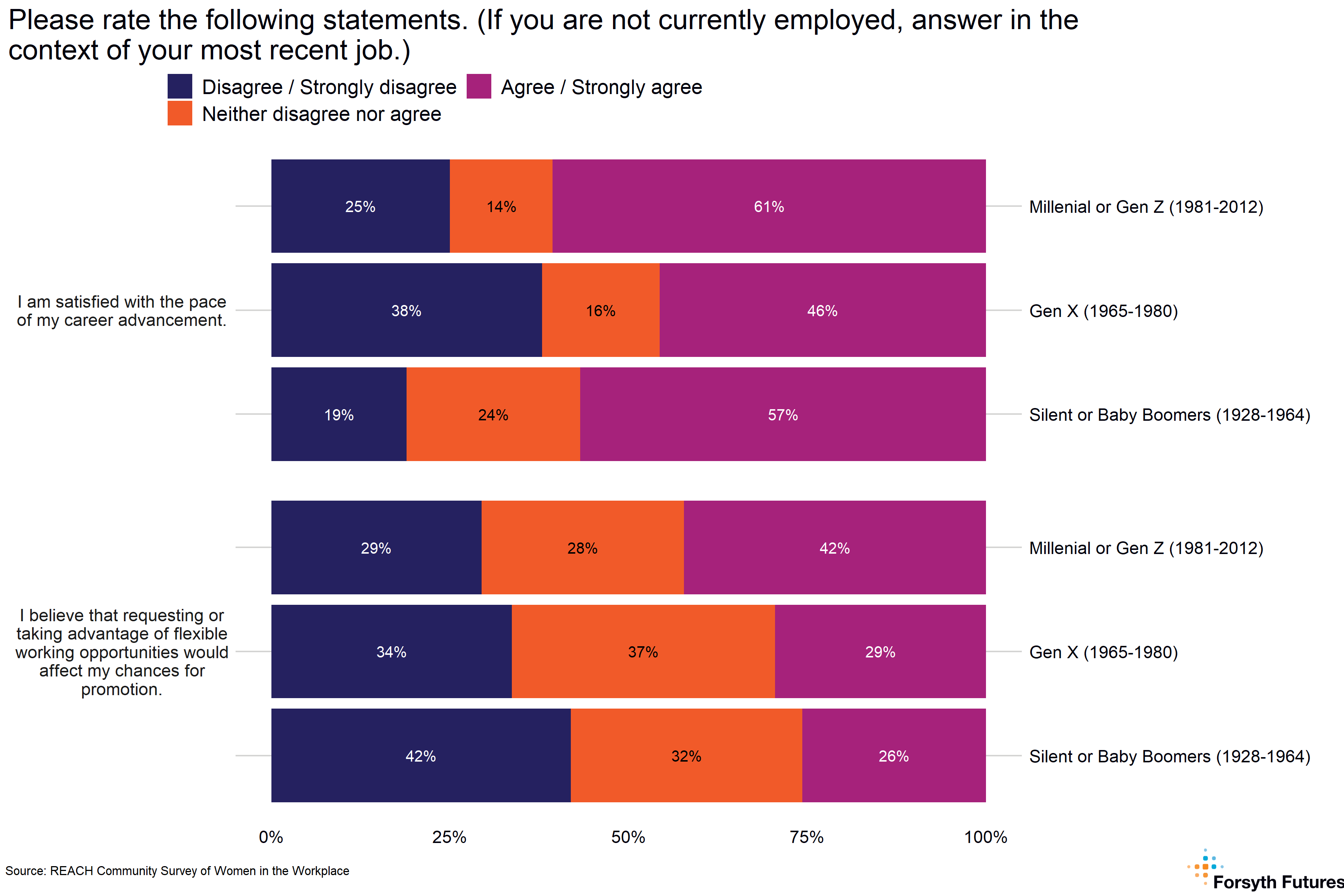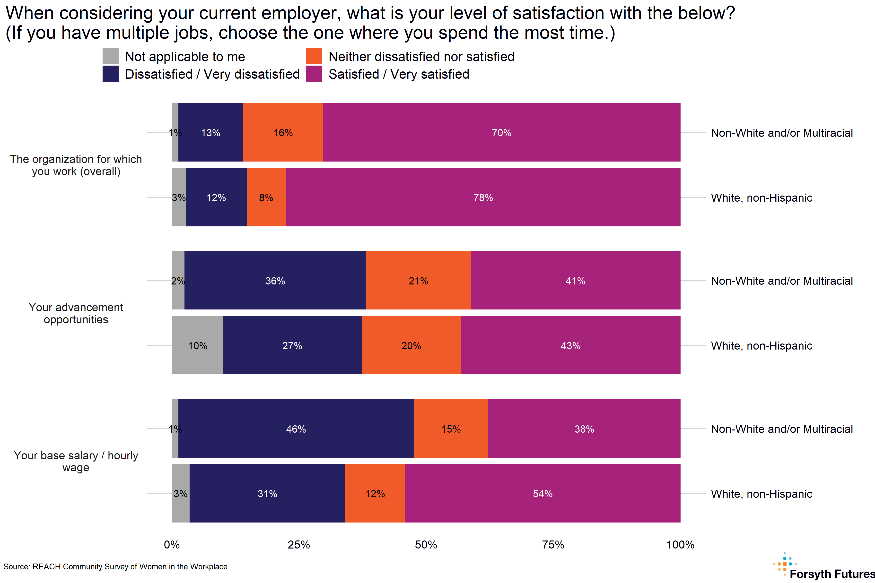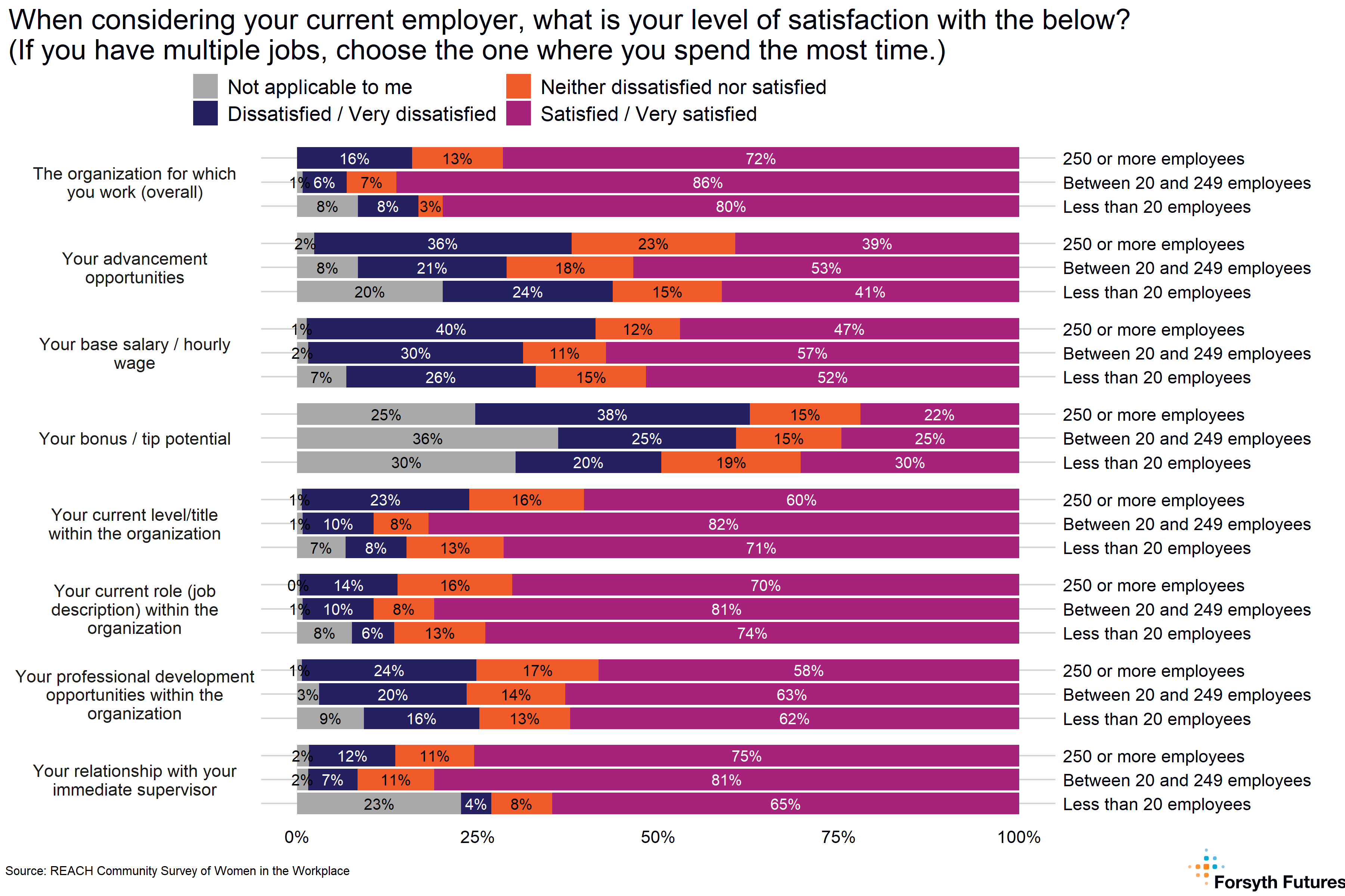 - Women’s level of satisfaction with their employers relating to advancement opportunities was the only aspect of satisfaction with their employer that varied consistently across all disaggregations.