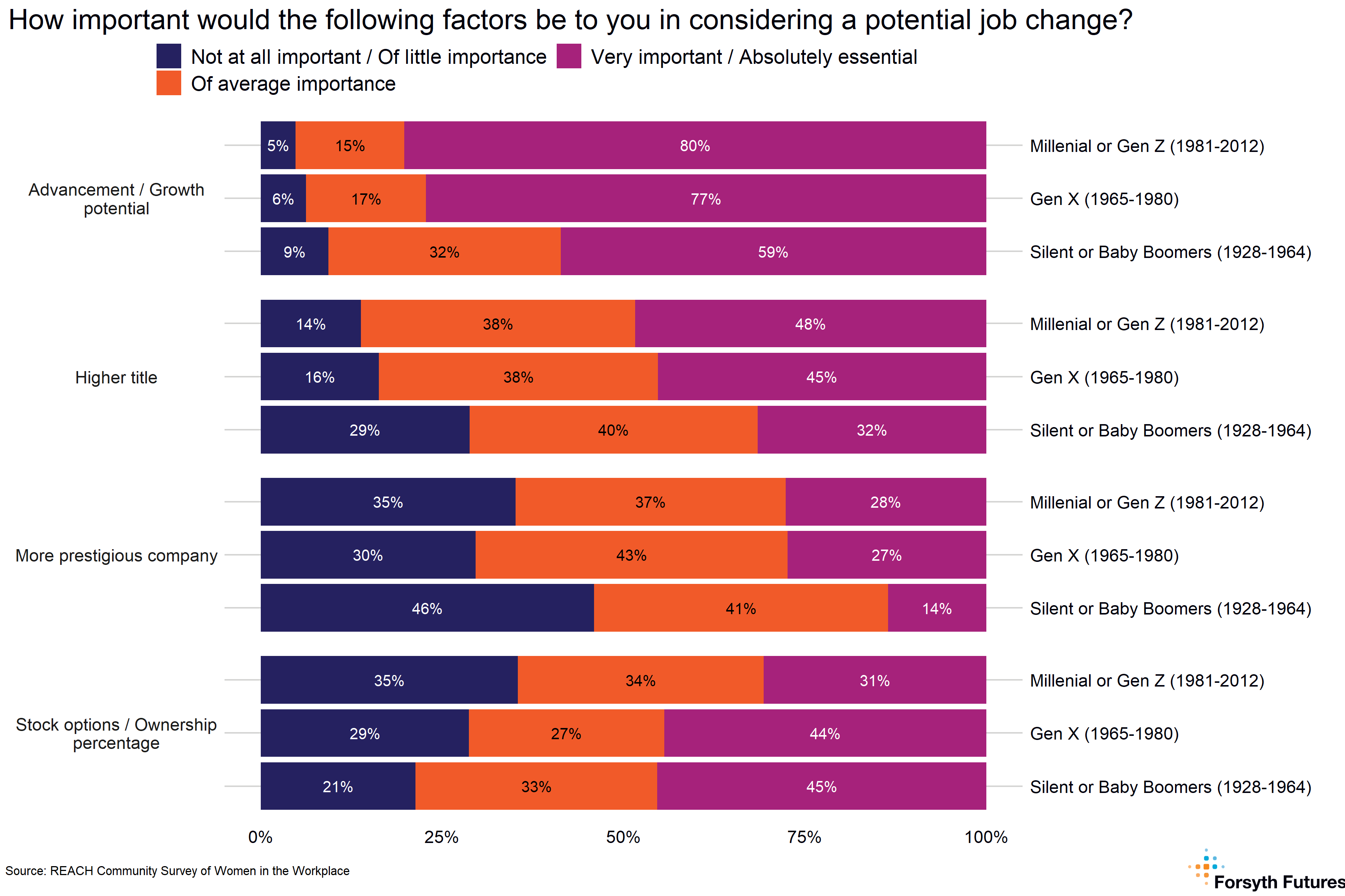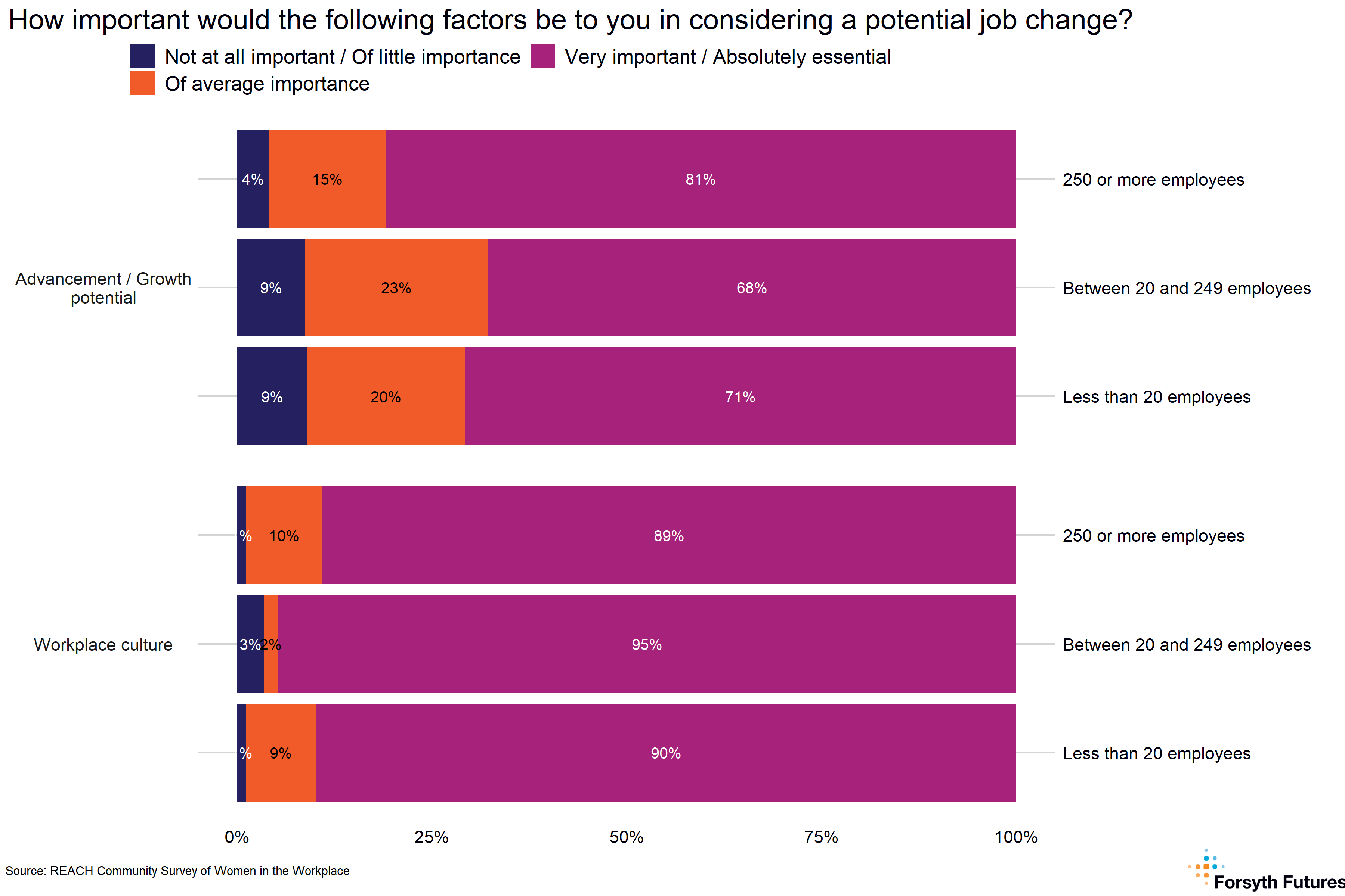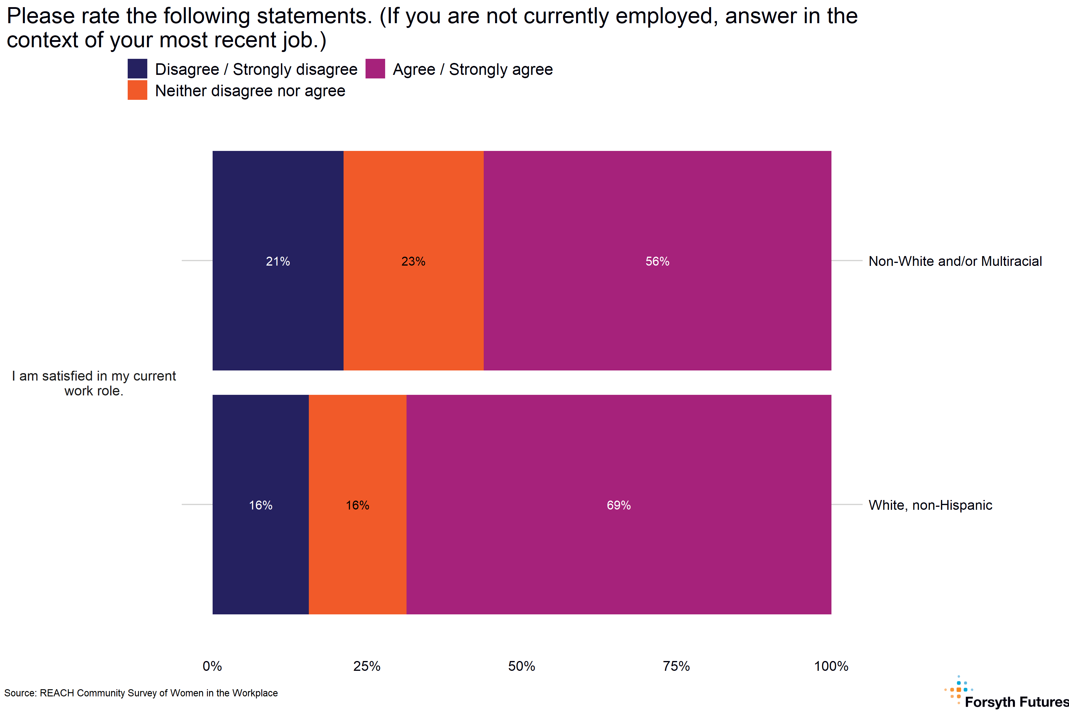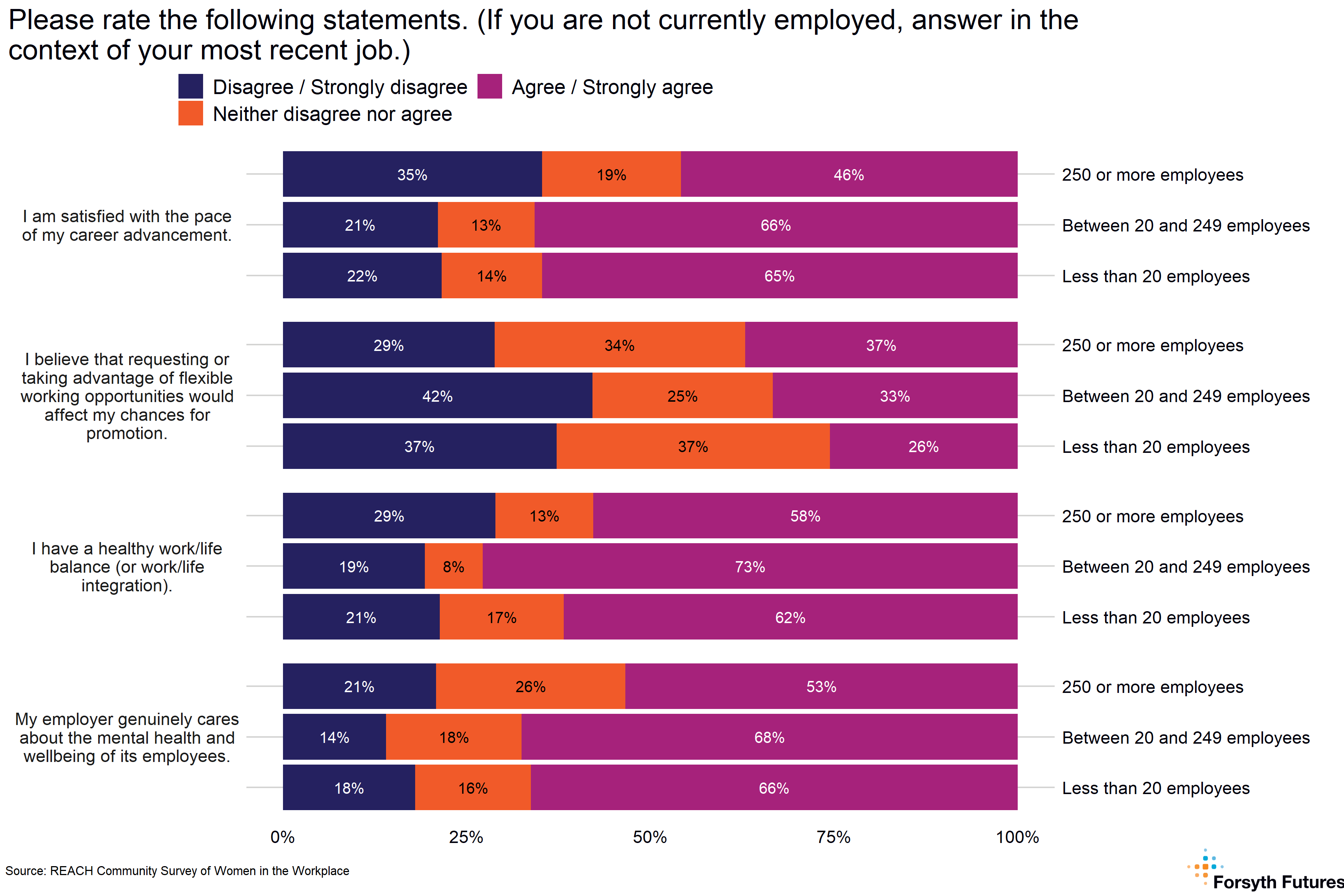 - Women’s level of satisfaction with their employers relating to advancement opportunities was the only aspect of satisfaction with their employer that varied consistently across all disaggregations.